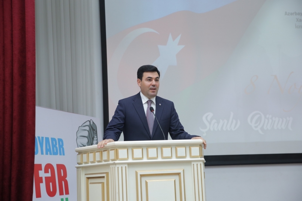 “İki sahil” xəbər verir ki, “Şanlı qürur tariximiz” adlı konfransda çıxış edən Milli Məclisin üzvü, Xaçmaz rayon İcra Hakimiyyətinin başçısı Elnur Rzayev və başqa natiqlər qeyd ediblər ki, Müzəffər Ali Baş Komandanımız İlham Əliyevin rəhbərliyi altında Vətən Müharibəsi və ondan sonrakı dövrdə Azərbaycan misilsiz hərbi, siyasi, diplomatik qələbələr qazanıb, ərazi bütövlüyümüz və suverenliyimiz tam təmin olunub.