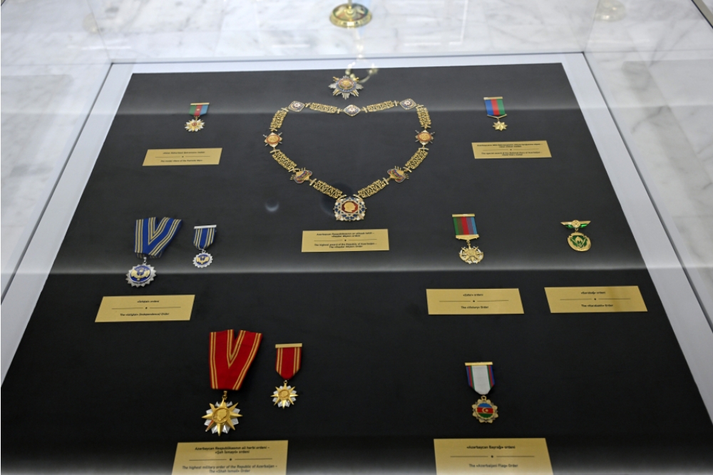 Azərbaycan Silahlı Qüvvələrinin bayraqları, medalları, emblem və şevronları isə muzeyin D salonunda sərgilənir.
