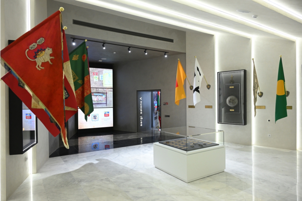 A Sərgi salonunda ölkəmizin qədim və orta əsrlər dövrünə aid bayraqlar, bayraq ucluqları, hakimiyyət rəmzləri, sikkələr, silahlar və XIX əsr Azərbaycan şəhərlərinin gerbləri nümayiş olunur.