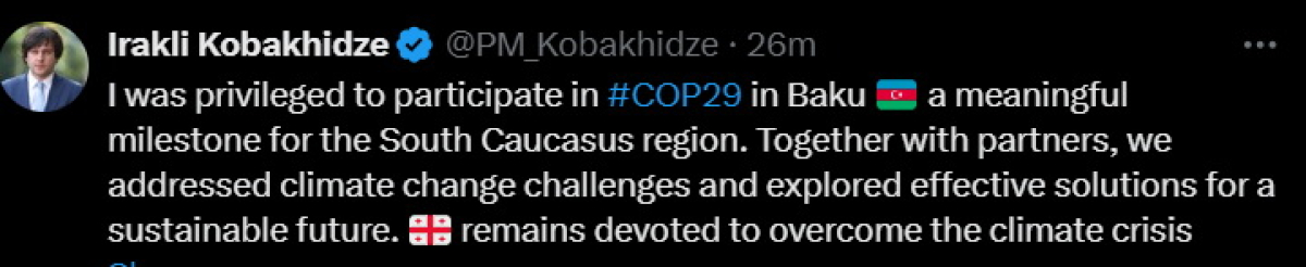“Bakıda davam edən BMT-nin iqlim dəyişikliyi konfransında iştirak etmək mənim üçün şərəfdir. Bu, Cənubi Qafqaz regionu üçün mühüm hadisədir. Biz tərəfdaşlarımızla birlikdə iqlim dəyişikliyindən yaranan problemləri və davamlı gələcək üçün onların effektiv həlli yollarını müzakirə etdik”, – deyə Baş nazir vurğulayıb.