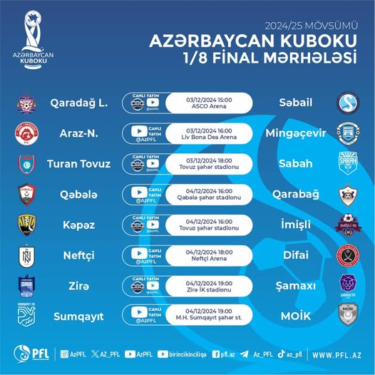 Bu gün Azərbaycan kubokunda 1/8 final mərhələsinin oyunlarına start veriləcək.
