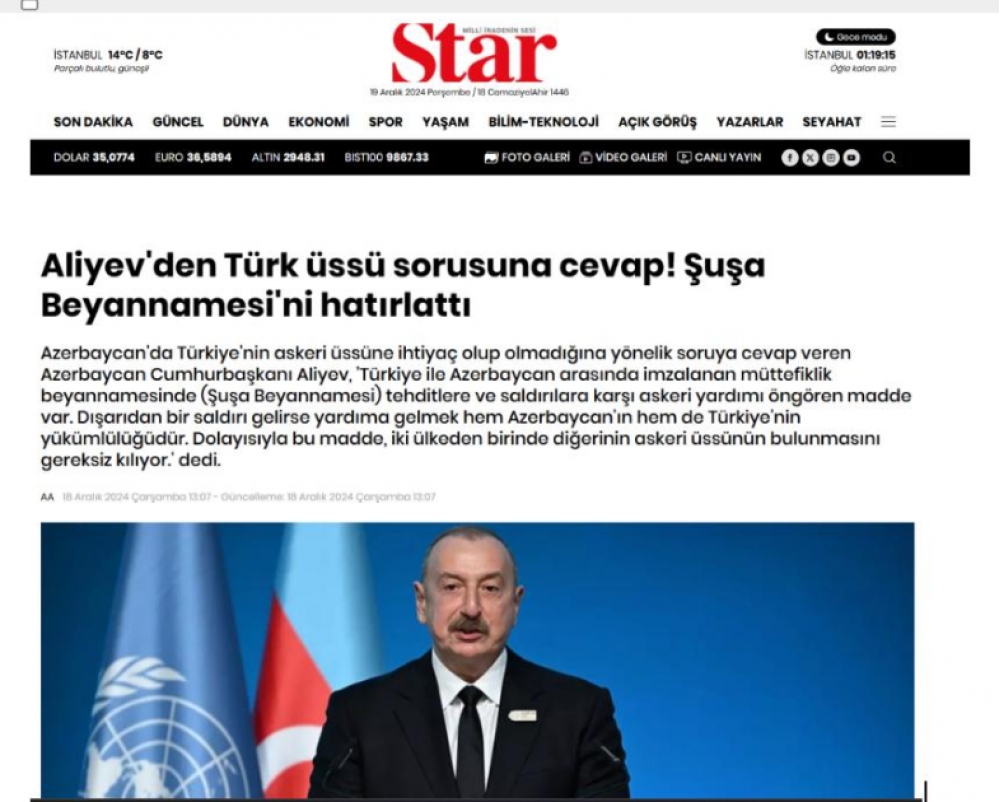 “Star” qəzeti isə Prezident İlham Əliyevin jurnalistin Türkiyənin Azərbaycanda hərbi bazasına ehtiyacın olub-olmaması ilə bağlı sualına cavabını dərc edib: “Müttəfiqlik haqqında Bəyannamədə təhlükə və ya təcavüz zamanı qarşılıqlı hərbi yardımı nəzərdə tutan bənd var. Yəni, bu, həm Azərbaycanın, həm də Türkiyənin bir öhdəliyidir ki, əgər bu və ya digər ölkə xarici təhlükə və xarici təcavüzlə üzləşsə, köməyə gəlməlidir”.