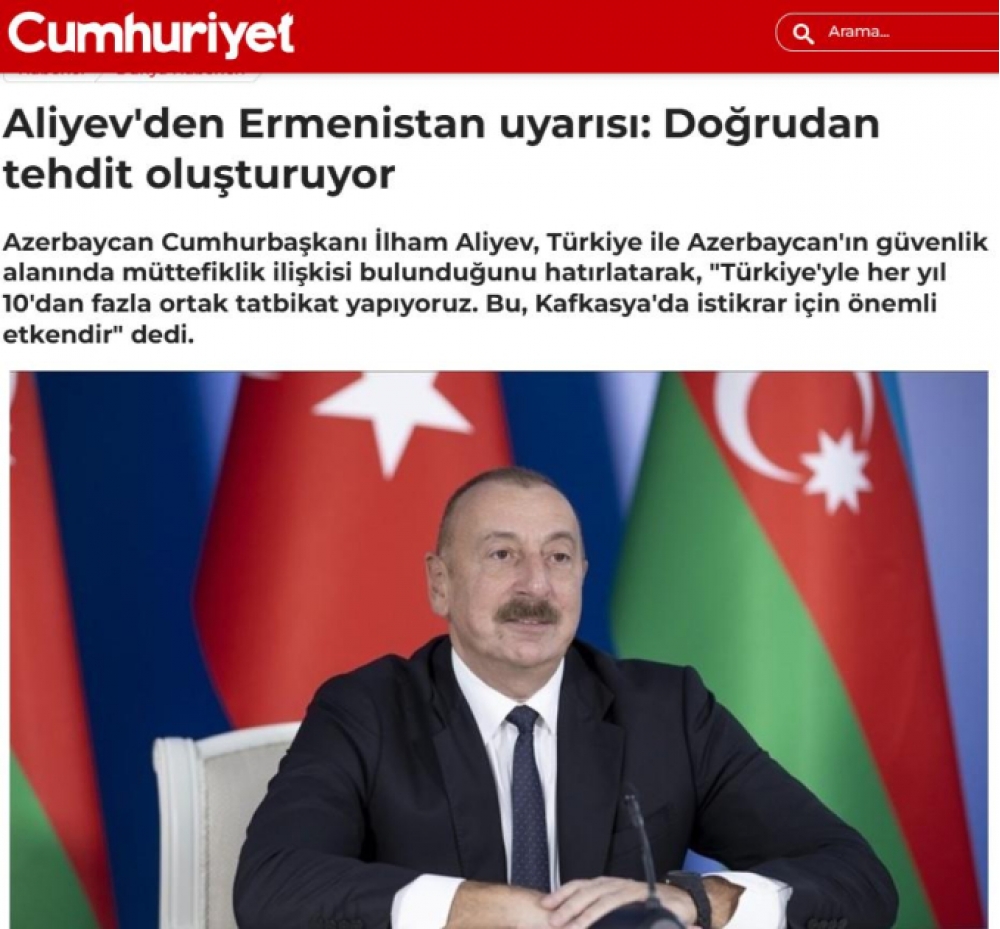 Türkiyənin Anadolu Agentliyinin, “Cumhuriyet” qəzetinin, “BengüTürk” telekanalının xəbərlərində vurğulanır ki, Prezident İlham Əliyev müsahibəsində Türkiyə ilə Azərbaycan arasında təhlükəsizlik sahəsində müttəfiqlik münasibətləridən bəhs edərək, hər il ölkələrimizin 10-dan çox birgə təlim keçirdiyini, bunun Qafqazda sabitlik üçün mühüm amil olduğunu bildirib.