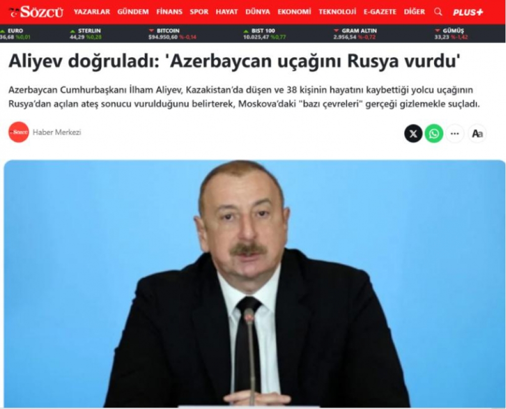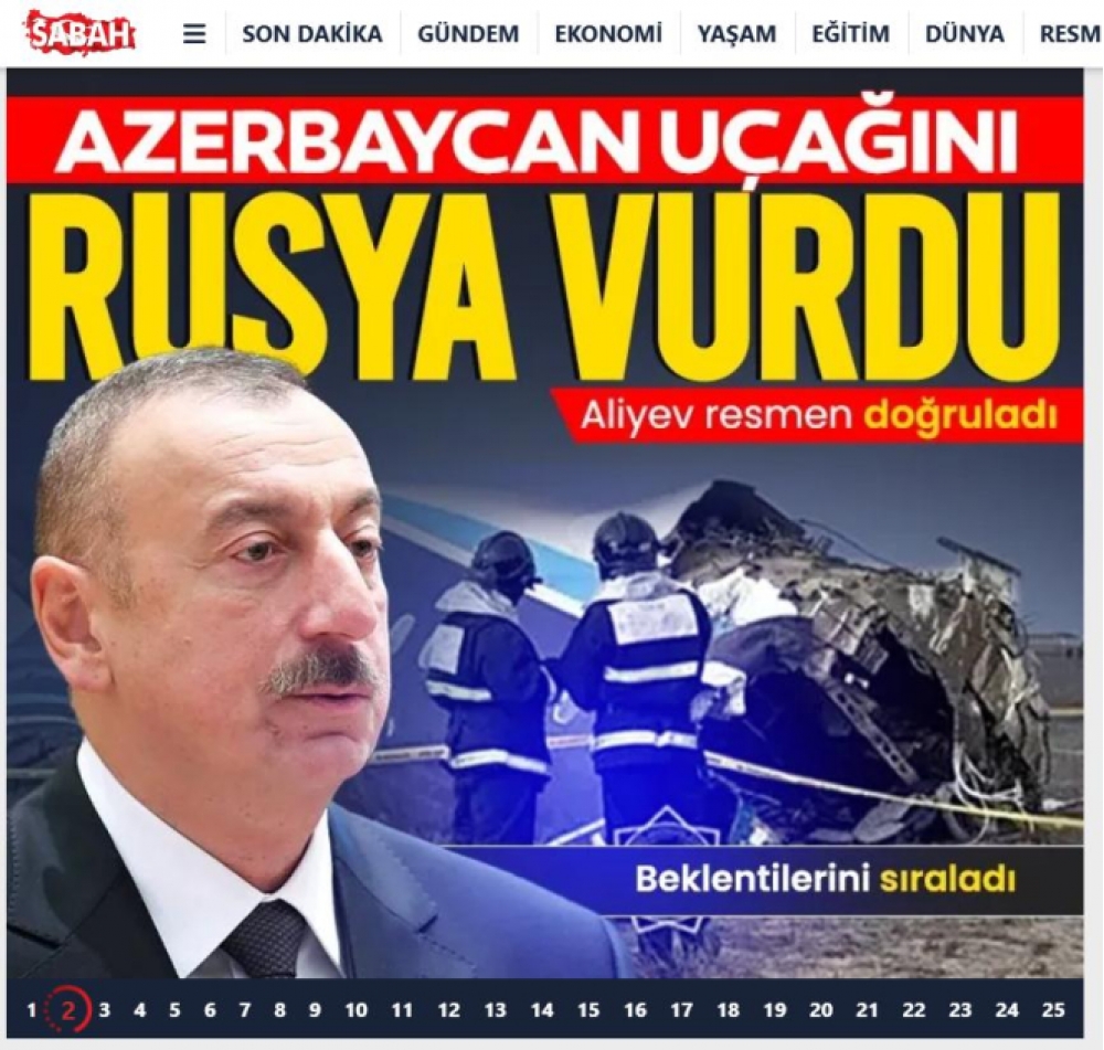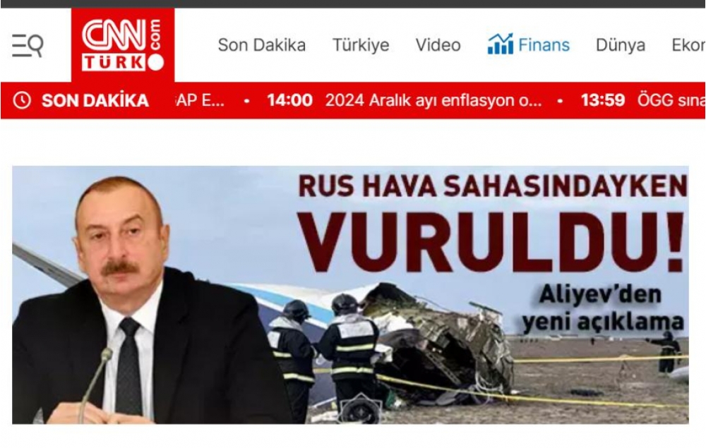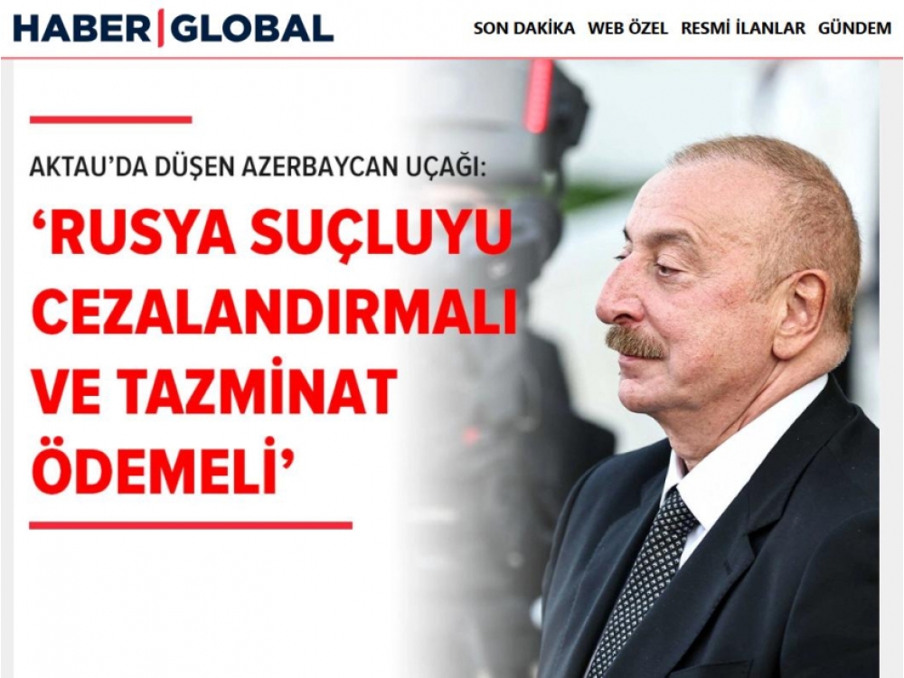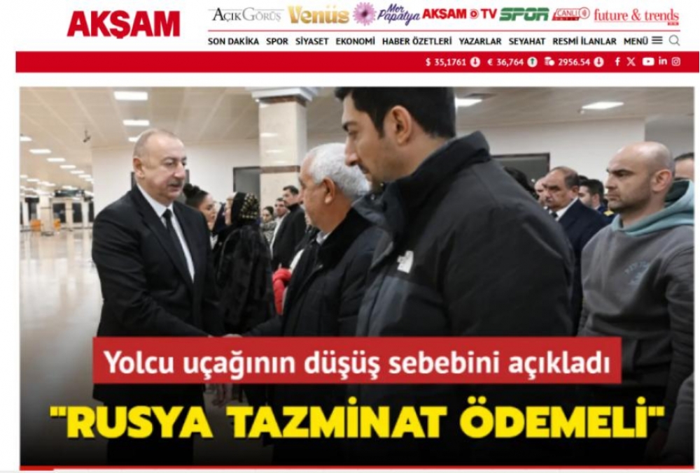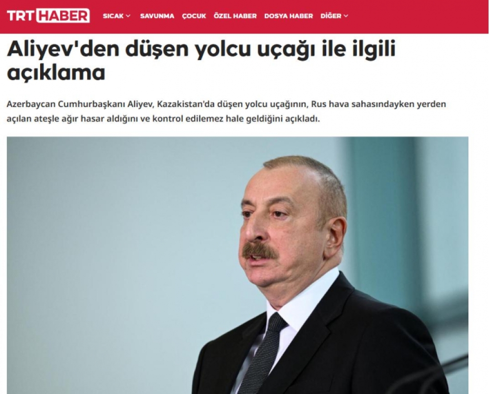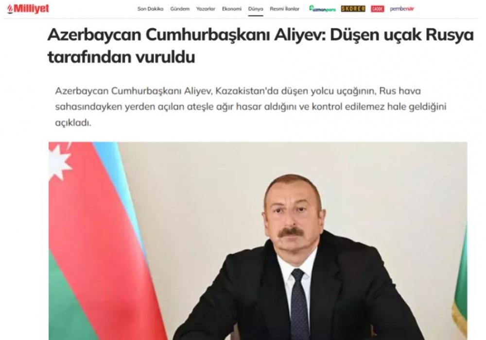Türkiyə mətbuatı Prezident İlham Əliyevin Azərbaycan Televiziyasına müsahibəsini geniş işıqlandırıb. Dövlət başçısı müsahibədə Aktau şəhəri yaxınlığında “Azərbaycan Hava Yollarına” (AZAL) məxsus təyyarənin qəzaya uğraması ilə bağlı rəsmi Bakının mövqeyini açıqlayıb.