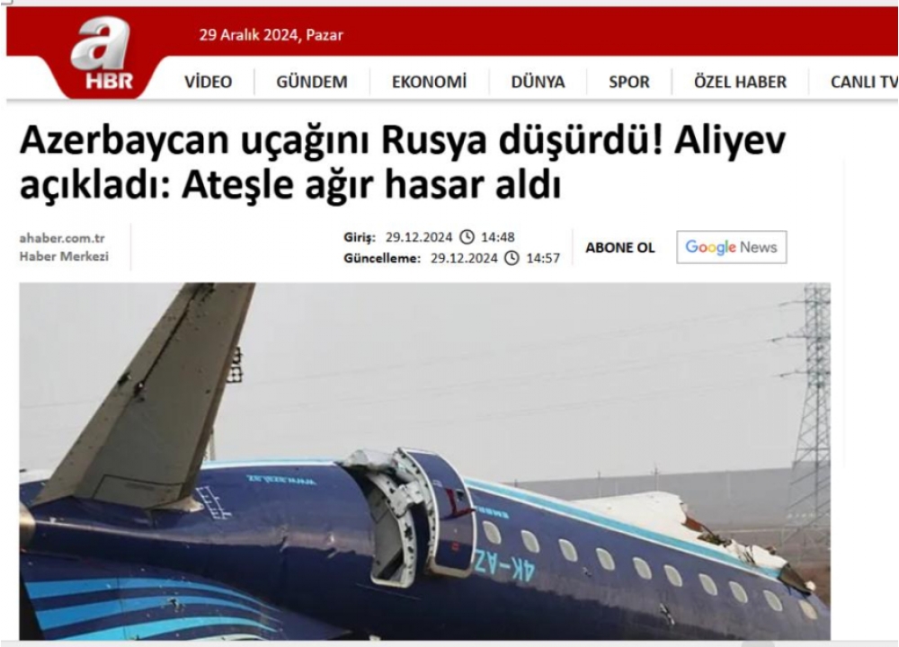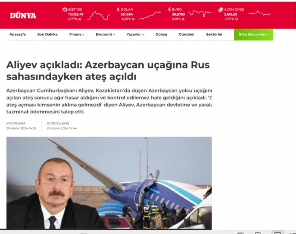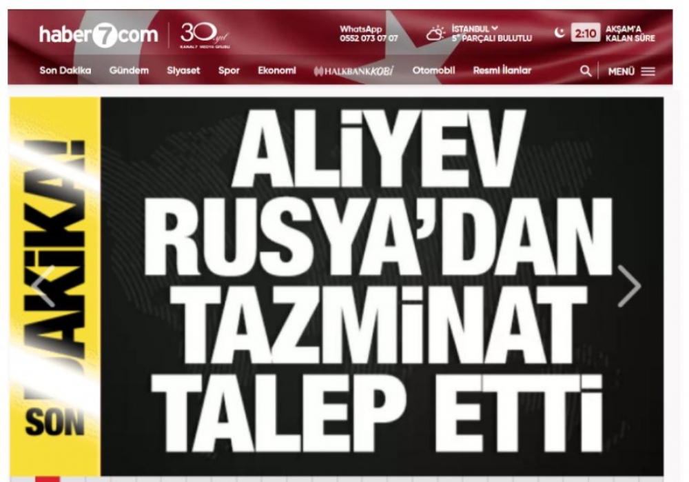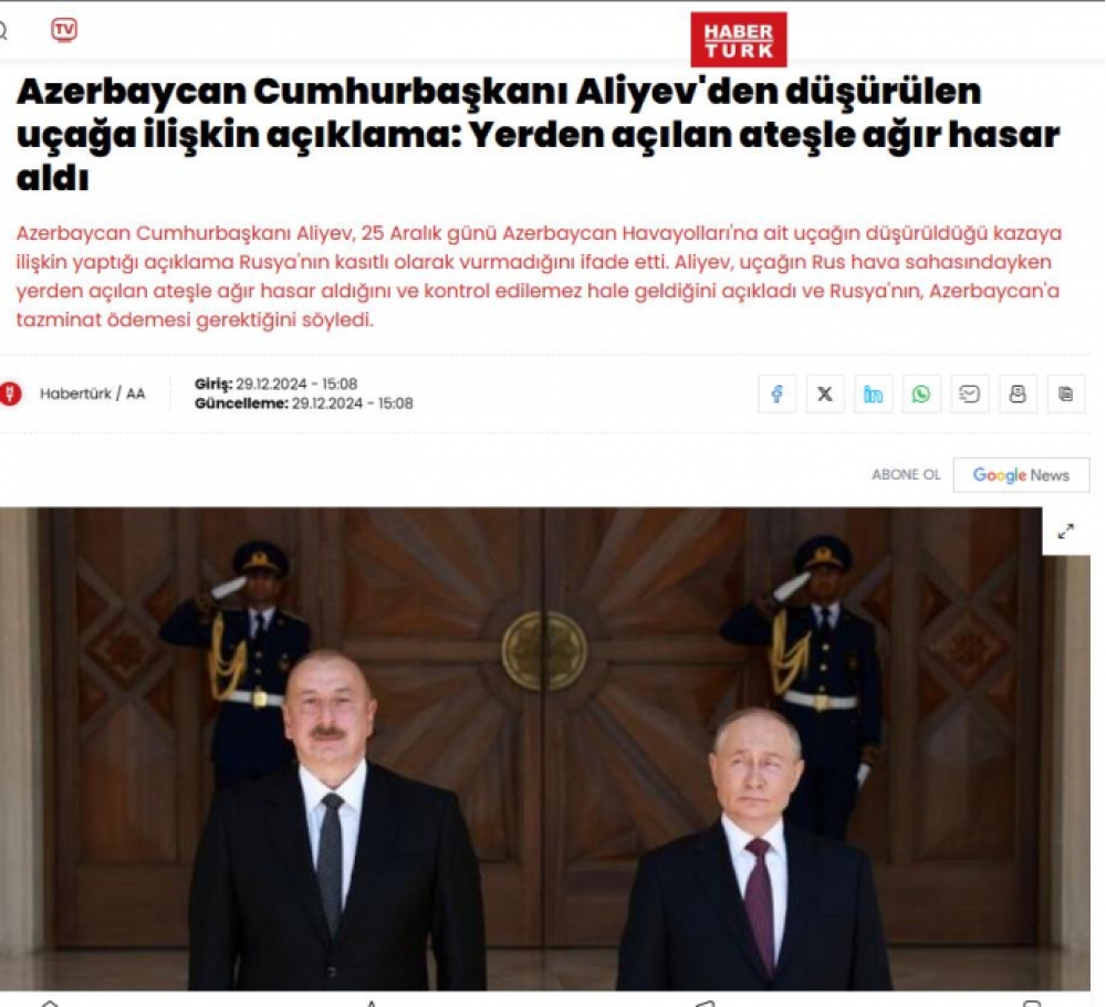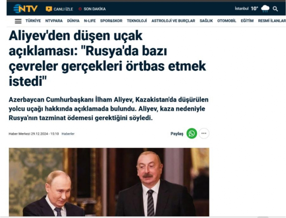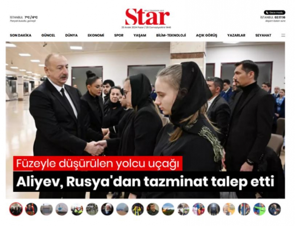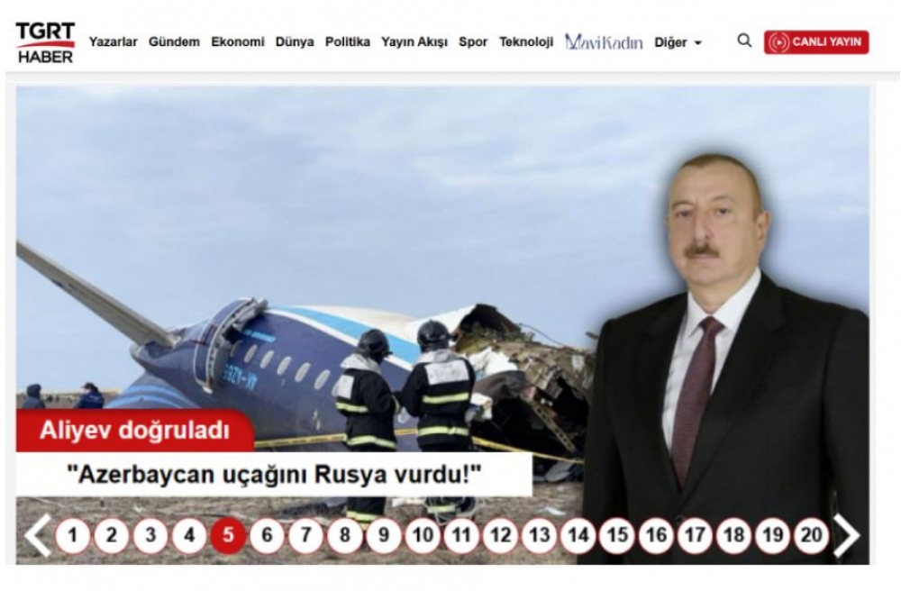 Türkiyə mətbuatı Prezident İlham Əliyevin Azərbaycan Televiziyasına müsahibəsini geniş işıqlandırıb. Dövlət başçısı müsahibədə Aktau şəhəri yaxınlığında “Azərbaycan Hava Yollarına” (AZAL) məxsus təyyarənin qəzaya uğraması ilə bağlı rəsmi Bakının mövqeyini açıqlayıb.