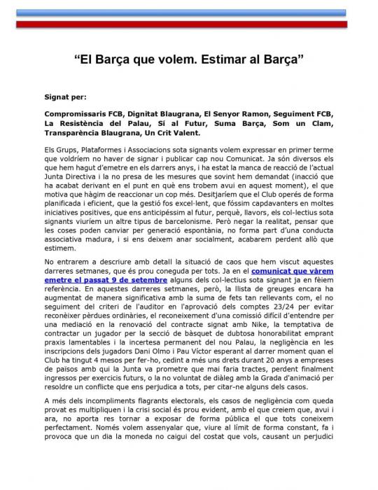 Tələbin önündə müvafiq olaraq "Si al Futur" və "Some un Clam" layihələrinin rəhbərləri, klub prezidentliyinə namizədlər Viktor Font və Joan Kamprubi dayanır. Laporta onların tələblərini qəbul etməkdən imtina edərsə, müxalifət prezidentə etimadsızlıq səsverməsi keçirə bilərlər.