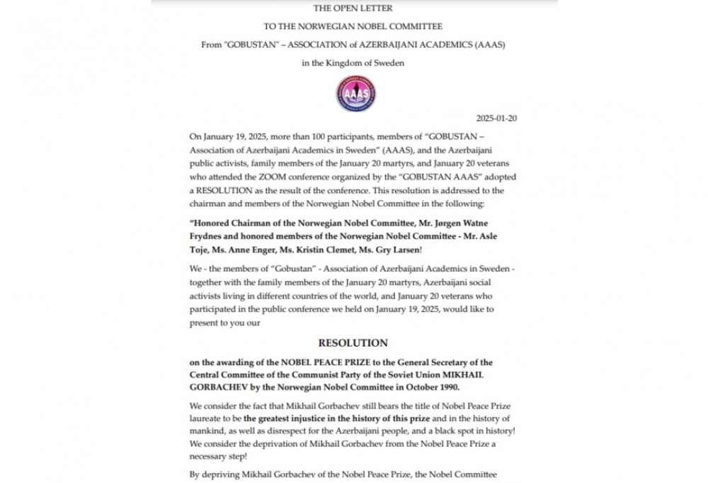 mükafatının verilməsinin ədalətsiz olması ilə bağlı məsələ qaldırılıb. Sənəddə qeyd olunur ki, 1990-cı il 20 Yanvar faciəsinə görə əsas məsuliyyəti M.Qorbaçov daşıyır. Məhz onun əmri ilə sovet ordusu Bakıya və Azərbaycanın digər ərazilərinə daxil olub.