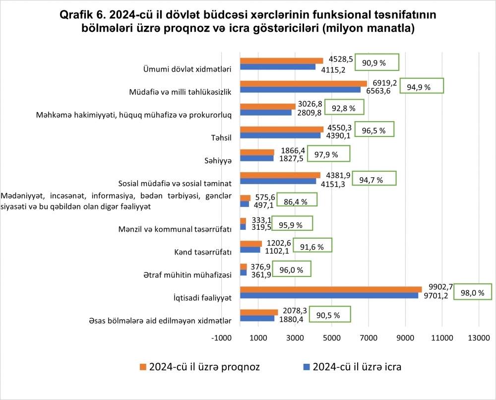 2024-cü il üzrə funksional təsnifata müvafiq olaraq iqtisadi fəaliyyət xərcləri 98 faiz və ya 9 milyard 701,2 milyon manat, səhiyyə xərcləri 97,9 faiz və ya 1827,5 milyon manat, təhsil xərcləri 96,5 faiz və ya 4 milyard 390,1 milyon manat, ətraf mühitin mühafizəsi xərcləri 96 faiz və ya 361,9 milyon manat, mənzil və kommunal təsərrüfatı xərcləri 95,9 faiz və ya 319,5 milyon manat, müdafiə və milli təhlükəsizlik xərcləri 94,9 faiz və ya 6 milyard 563,6 milyon manat, sosial müdafiə və sosial təminat xərcləri 94,7 faiz və ya 4 milyard 151,3 milyon manat, məhkəmə hakimiyyəti, hüquq mühafizə və prokurorluq bölməsi üzrə xərcləri 92,8 faiz və ya 2 milyard 809,8 milyon manat, kənd təsərrüfatı xərcləri 91,6 faiz və ya 1 milyard 102,1 milyon manat, ümumi dövlət xidmətləri xərcləri 90,9 faiz və ya 4 milyard 115,2 milyon manat, əsas bölmələrə aid edilməyən xidmətlər bölməsi üzrə xərcləri 90,5 faiz və ya 1 milyard 880,4 milyon manat, mədəniyyət, incəsənət, informasiya, bədən tərbiyəsi, gənclər siyasəti və bu qəbildən olan digər fəaliyyət xərcləri 86,4 faiz və ya 497,1 milyon manat təşkil edib.