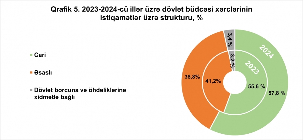 2024-cü il dövlət büdcəsi xərclərinin 21 milyard 800,3 milyon manatı və ya 57,8 faizi cari xərclərə (2023-cü illə müqayisədə 1 milyard 532,2 milyon manat və ya 7,6 faiz çox), 14 milyard 623,8 milyon manatı və ya 38,8 faizi əsaslı xərclərə (2023-cü illə müqayisədə 383,5 milyon manat və ya 2,6 faiz az), 1 milyard 295,6 milyon manatı və ya 3,4 faizi dövlət borcuna xidmətlə bağlı xərclərə (2023-cü illə müqayisədə 113,1 milyon manat və ya 9,6 faiz çox) yönəldilib.