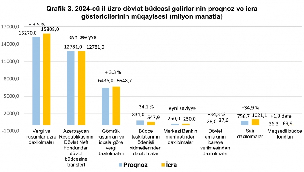 2024-cü ildə dövlət büdcəsinin gəlirləri üzrə təsdiq edilmiş proqnozdan vergi və rüsumlar üzrə daxilolmalar 538 milyon manat və ya 3,5 faiz, gömrük rüsumları və idxala görə vergi daxilolmaları 213,7 milyon manat və ya 3,3 faiz, dövlət əmlakının icarəyə verilməsindən daxilolmalar 9,6 milyon manat və ya 34,3 faiz, məqsədli büdcə fondları (Azərbaycan Respublikası Ekologiya və Təbii Sərvətlər Nazirliyinin tabeliyində olan məqsədli büdcə fondları və Nəqliyyat vasitələrinin utilizasiya fondu) üzrə daxilolmalar 33,6 milyon manat və ya 1,9 dəfə, sair gəlirlər üzrə daxilolmalar isə 264,4 milyon manat və ya 34,9 faiz çox, büdcə təşkilatlarının ödənişli xidmətlərindən daxilolmalar 283,1 milyon manat və ya 34,1 faiz az təmin edilib.