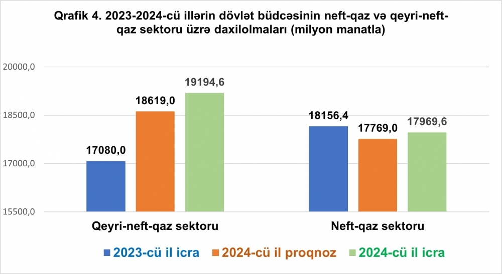 2024-cü ilin dövlət büdcəsinin gəlirlərində neft-qaz sektoru üzrə daxilolmaların 26,6 faizi və ya 4 milyard 780,5 milyon manatı vergi orqanlarının xətti ilə daxilolmalar, 2,3 faizi və ya 408 milyon manatı sair daxilolmalar, 71,1 faizi və ya 12 milyard 781 milyon manatı Azərbaycan Respublikasının Dövlət Neft Fondundan dövlət büdcəsinə transfert təşkil edir.