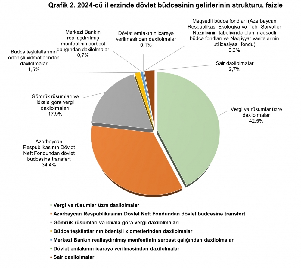 2024-cü ilin dövlət büdcəsinin gəlirlərinin 15 milyard 808 milyon manatı və ya 42,5 faizi vergi və rüsumlar üzrə daxilolmalarının, 12 milyard 781 milyon manatı və ya 34,4 faizi Azərbaycan Respublikasının Dövlət Neft Fondundan dövlət büdcəsinə transfertin, 6 milyard 648,7 milyon manatı və ya 17,9 faizi gömrük rüsumları və idxala görə vergi daxilolmalarının, 547,9 milyon manatı və ya 1,5 faizi büdcə təşkilatlarının ödənişli xidmətlərindən daxilolmaların, 250 milyon manatı və ya 0,7 faizi Mərkəzi Bankın reallaşdırılmış mənfəətinin sərbəst qalığından daxilolmaların, 37,6 milyon manatı və ya 0,1 faizi dövlət əmlakının icarəyə verilməsindən daxilolmaların, 1021,1 milyon manatı və ya 2,7 faizi sair daxilolmaların, 69,9 milyon manatı və ya 0,2 faizi məqsədli büdcə fondları (Azərbaycan Respublikası Ekologiya və Təbii Sərvətlər Nazirliyinin tabeliyində olan məqsədli büdcə fondları və Nəqliyyat vasitələrinin utilizasiya fondu) üzrə daxilolmaların payına düşür.