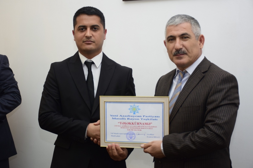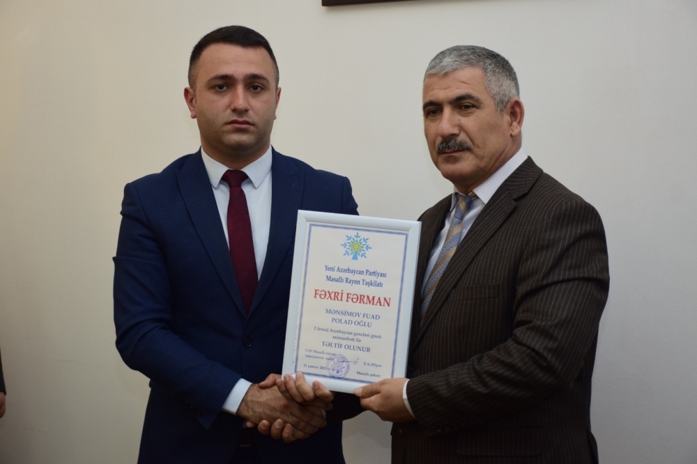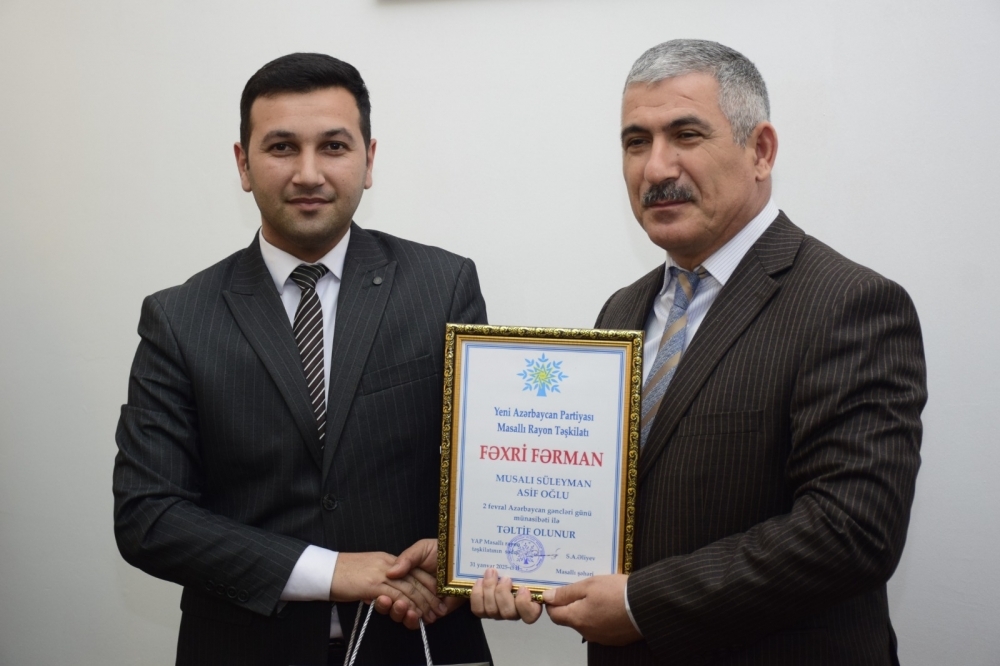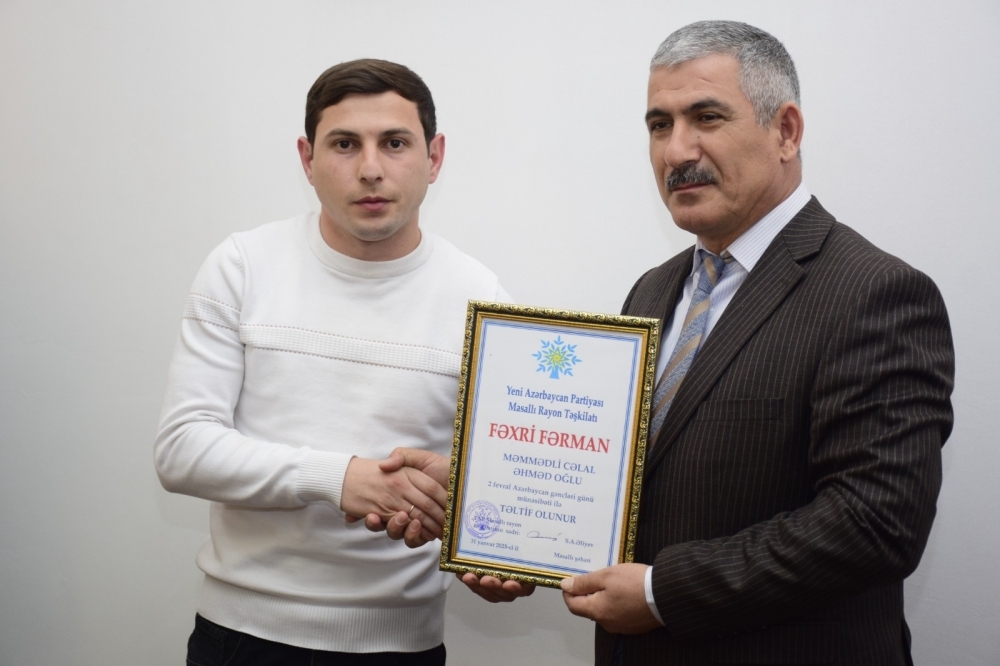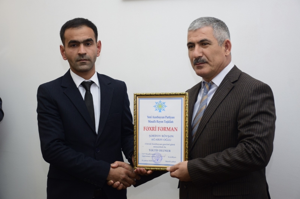 Gəncləri 2 fevral-Azərbaycan Gəncləri günü münasibəti ilə təbrik edən YAP Masallı rayon təşkilatının sədri Seyfəddin Əliyev çıxış edərək bildirmişdir ki, Azərbaycan gəncliyi ölkənin daxili ictimai-siyasi, həmçinin sosial-iqtisadi və digər sferalarında aktiv fəaliyyət göstərir, intellektual imkanları və kreativliyi ilə dövlətçiliyimizin möhkəmləndirilməsi işinə öz töhfəsini verir: “Azərbaycan gəncliyi ölkəmizi beynəlxalq aləmdə də layiqincə təmsil edir, dövlətimiz haqqında həqiqətlərin dünya ictimaiyyətinin diqqətinə çatdırılmasında, mədəni-mənəvi irsimizin təbliğ olunmasında fəallıq nümayiş etdirir. Məhz bütün bunlar gəncliyimiz üçün dövlətimiz tərəfindən yaradılmış əlverişli imkanlar, verilmiş mükəmməl təhsil və özünü təsdiqləmək üçün ideal məkan əsasında ərsəyə gəlib. Müasir Azərbaycan gəncliyi unutmur ki, onlar müstəqil dövlətin azad gəncləri olaraq, bugünkü uğurlara məhz ümummilli lider Heydər Əliyevin əsasını qoyduğu və hazırda Prezident cənab İlham Əliyevin uğurla davam etdirdiyi siyasi kurs nəticəsində sahib olublar”.