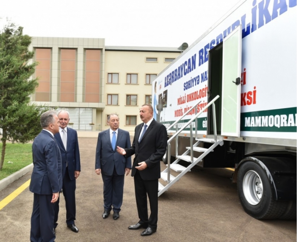 Milli Onkologiya Mərkəzinin direktoru Cəmil Əliyev dövlətimizin başçısına məlumat verdi ki, 2007-ci ildən başlayaraq Mərkəzin həkimləri bölgələrə səfərlər edirlər. Tərkibi 14 nəfərdən ibarət həkim briqadasının səfərlərində məqsəd onkoloji xəstəliklərin erkən aşkarlanmasıdır. İndiyədək Mərkəzin əməkdaşları ölkənin 51 bölgəsində 50 minə yaxın insanı müayinədən keçiriblər. Mobil Diaqnostika Kompleksi müxtəlif kabinetlərdən və laboratoriyadan ibarətdir.