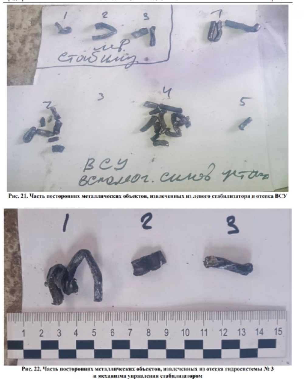 Hesabat 53 səhifədən ibarətdir. Sənəddə təyyarənin hidravlik sistem bölməsindən, stabilizator idarəetmə mexanizmindən və digər hissələrindən çıxarılan kənar metal obyektlərin, habelə təyyarənin zədələnmiş hissələrinin fotoları və bort qeydedicisinin yazıları da yer alıb.