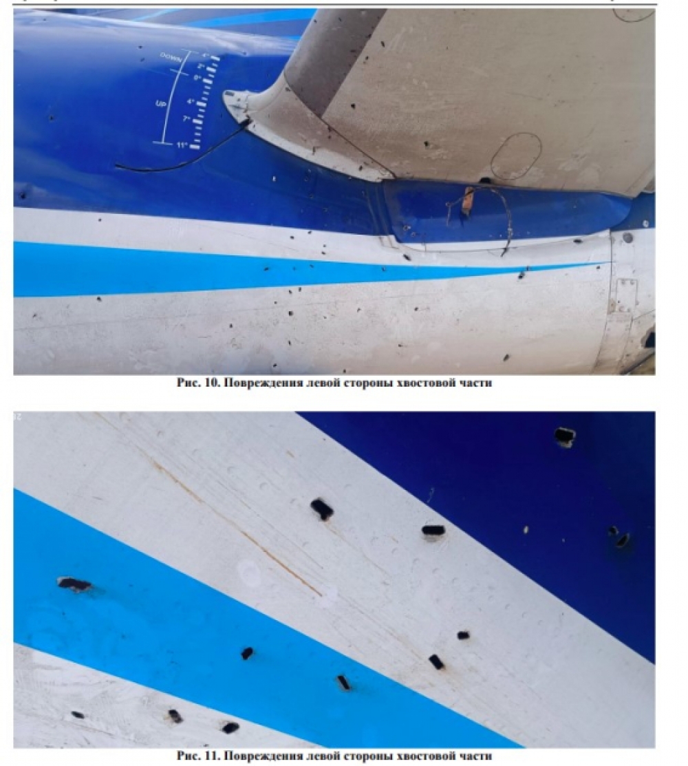 “Qorunub saxlanılan fraqmentlərin ilkin müayinəsi nəticəsində təyyarənin quyruq hissəsində, şaquli stabilizatorda və üfüqi stabilizatorda, sükan və istiqamət sükanlarında müxtəlifölçülü və formalı çoxsaylı deşik və qeyri-deşik zədələr aşkarlanıb. Oxşar zədələr hava gəmisinin sol mühərrikində və sol qanadında, həmçinin hava gəmisinin aqreqat və komponentlərində də aşkar edilib. Bəzi yerlərdə zədələr düzgün düzbucaqlı formaya malikdir”, - deyə hesabatda qeyd olunub.