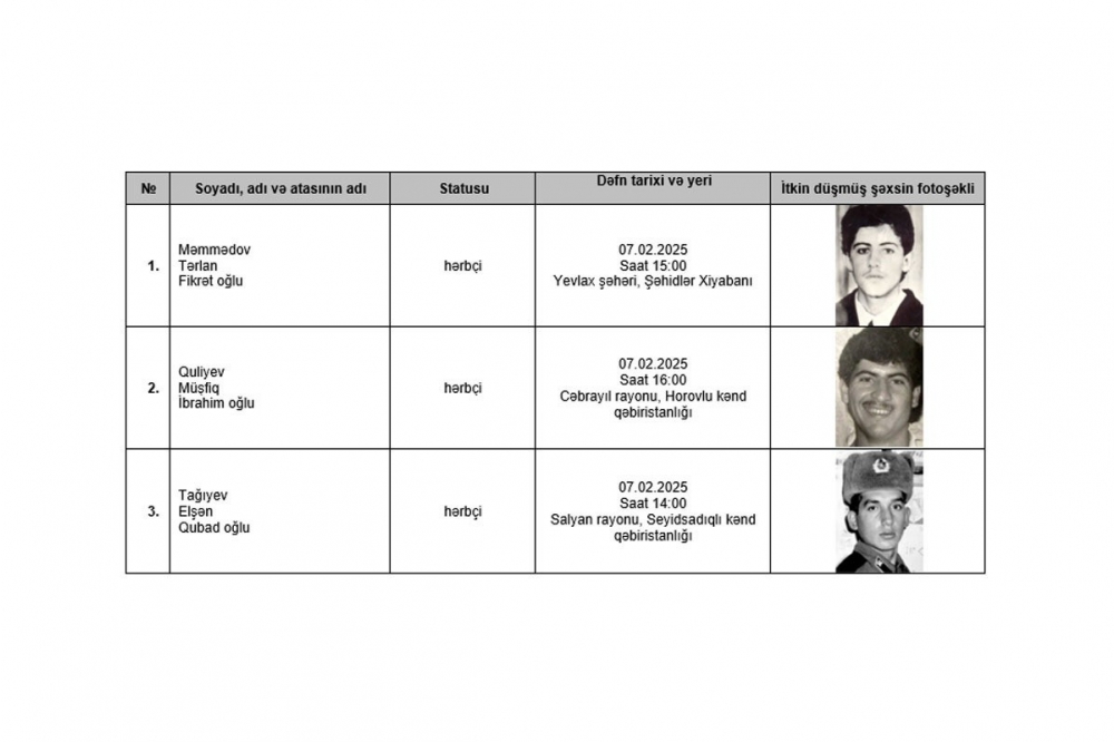Məlumata görə, itkin düşən hərbçilərin qalıqları fevralın 7-də dəfn olunacaq.