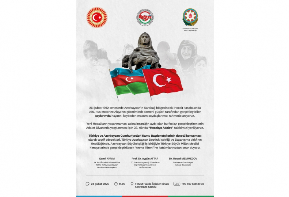 Fevralın 24-də Türkiyə Böyük Millət Məclisinin (TBMM) İctimaiyyətlə əlaqələr şöbəsinin konfrans zalında Xocalı soyqırımı qurbanlarının xatirəsini anma mərasimi keçiriləcək.