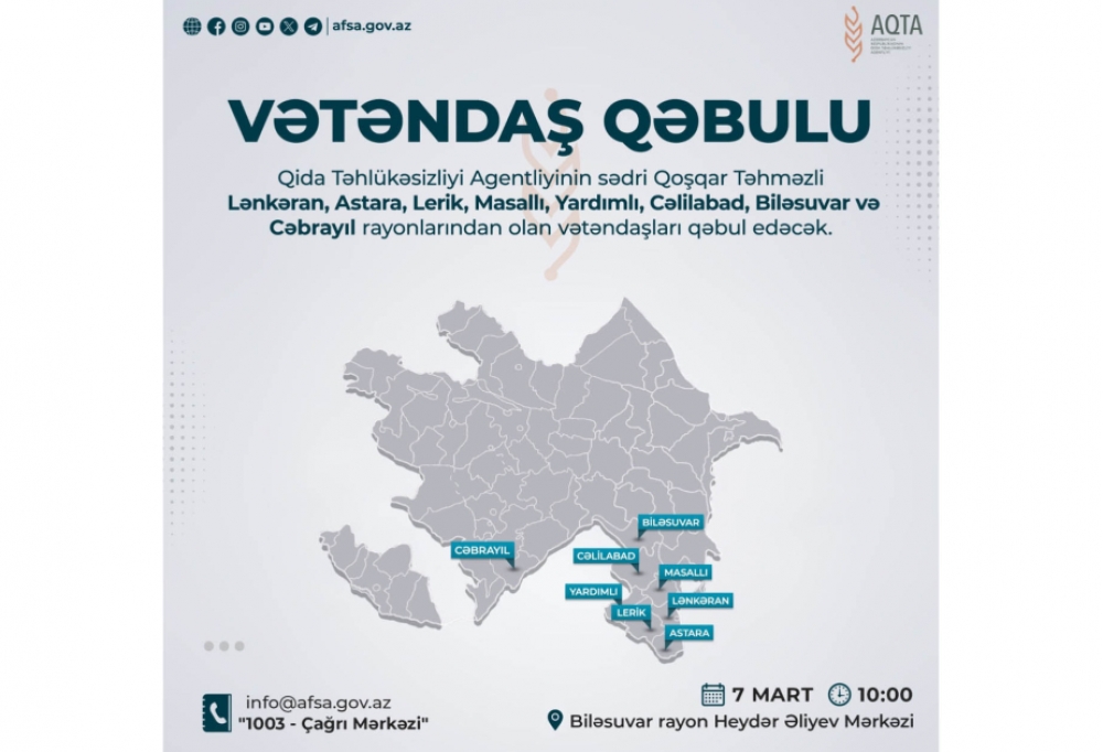 Martın 7-də saat 10:00-da Azərbaycan Qida Təhlükəsizliyi Agentliyinin (AQTA) sədri Qoşqar Təhməzli Biləsuvar rayon Heydər Əliyev Mərkəzində Lənkəran, Astara, Lerik, Masallı, Yardımlı, Cəlilabad, Biləsuvar və Cəbrayıl rayonlarından olan vətəndaşların müraciətlərini dinləyəcək.