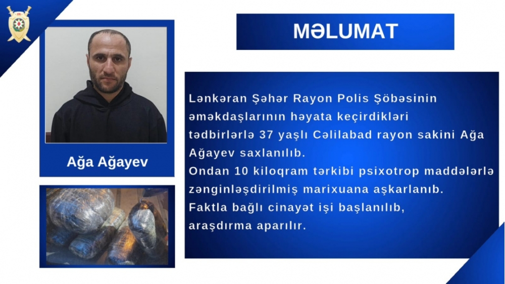 Lənkəran Şəhər Rayon Polis Şöbəsinin əməkdaşlarının keçirdikləri tədbirlər nəticəsində narkotik vasitələrin qanunsuz dövriyyəsini təşkil edən 37 yaşlı Ağa Ağayev saxlanılıb.