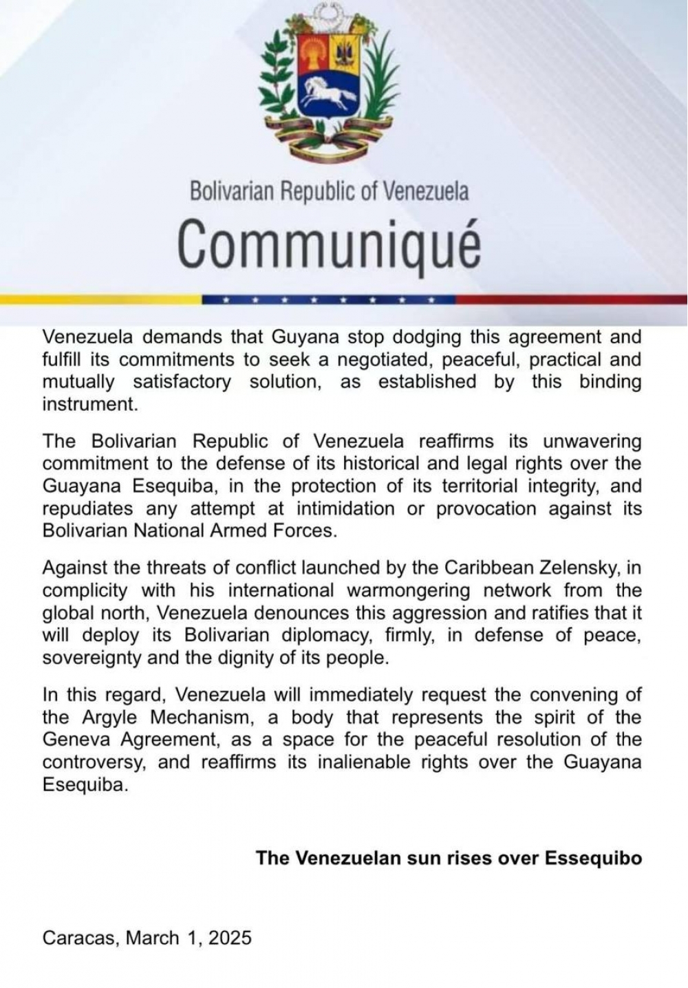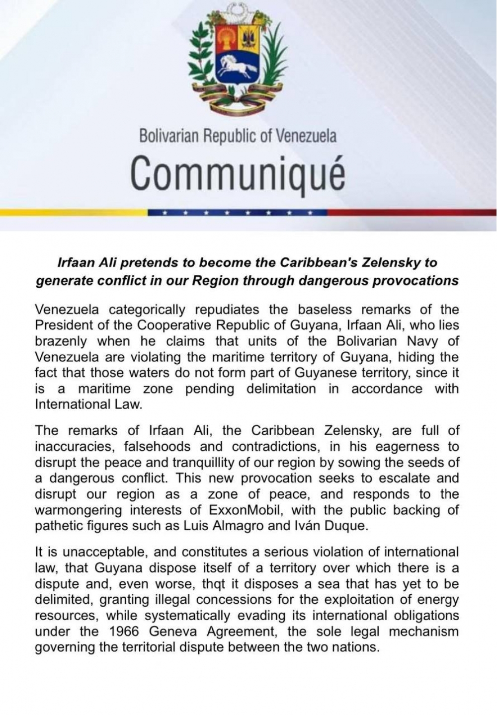 Sənəddə qeyd olunur ki, Venesuela Qayana Kooperativ Respublikasının prezidenti İrfaan Əlinin əsassız bəyanatlarını qəti şəkildə rədd edir. Venesuela Hərbi Dəniz Qüvvələri Qayananın ərazi sularını pozduğuğu iddia etsə də bu suların Qayana ərazisinin bir hissəsi olmadığını gizlədir. Çünki bu dəniz zonası beynəlxalq hüquqa əsasən delimitasiyaya məruz qalır”.