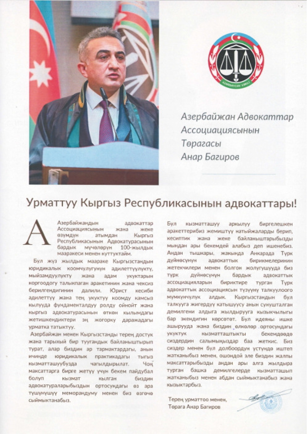 Nəzərə çatdırılıb ki, Qırğız Respublikası vəkilliyinin 100 illiyinə həsr olunmuş jurnal çap edilib. Jurnalda ARVK-nın sədri Anar Bağırovun da təbrik məktubu yer alıb. Məktubda vəkillik peşəsinin ədalətli cəmiyyət, qanunun aliliyinin təmin edilməsi və insan hüquqlarının qorunmasında oynadığı mühüm rol vurğulanıb.