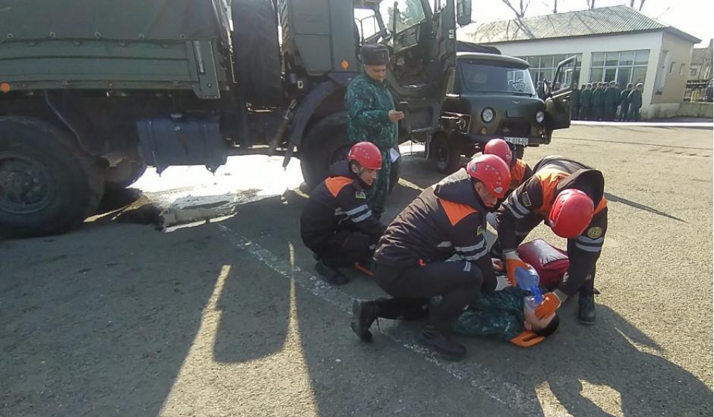 Təlimin praktiki hissəsində şərti nəqliyyat qəzası zamanı deformasiyaya uğramış avtomobildən “zərərçəkmişlər” xüsusi xilasetmə alət və avadanlıqlarından istifadə edilməklə xilas edilərək təxirəsalınmaz ilkin yardım göstərilib, eyni zamanda qəza zamanı ətrafa yayılan yanğın qısa zamanda söndürülüb.