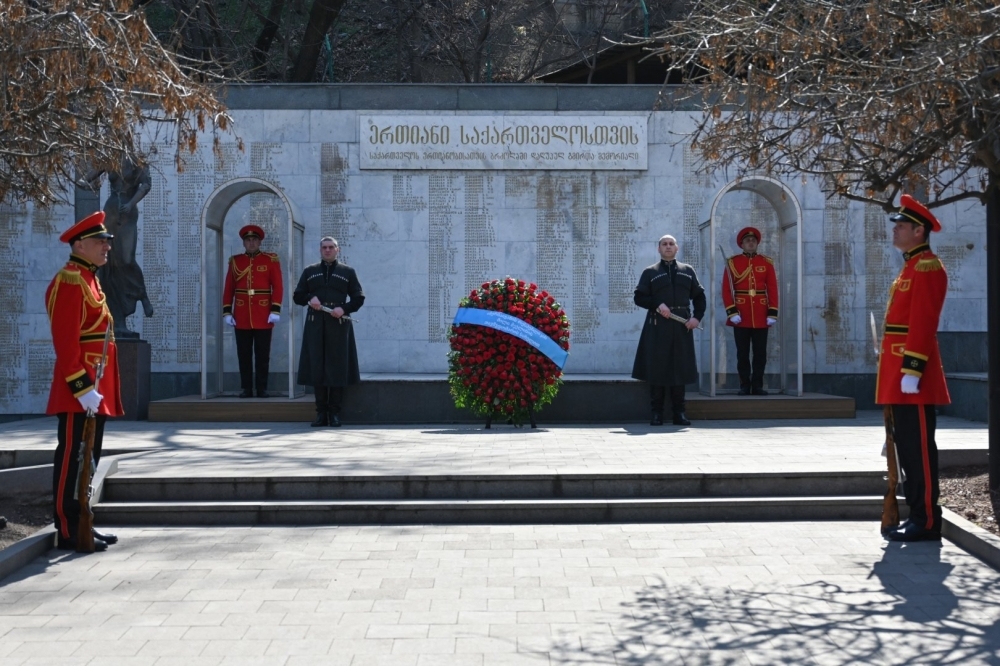 Spiker Sahibə Qafarova burada Gürcüstanın ərazi bütövlüyü uğrunda canlarından keçmiş qəhrəmanların abidəsi önünə əklil qoyub.
