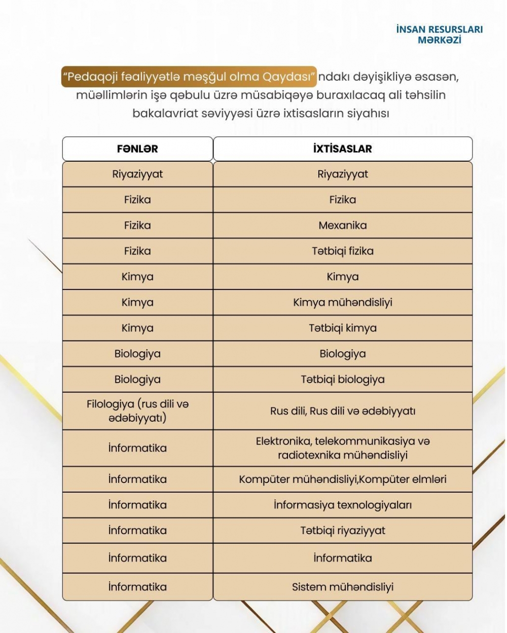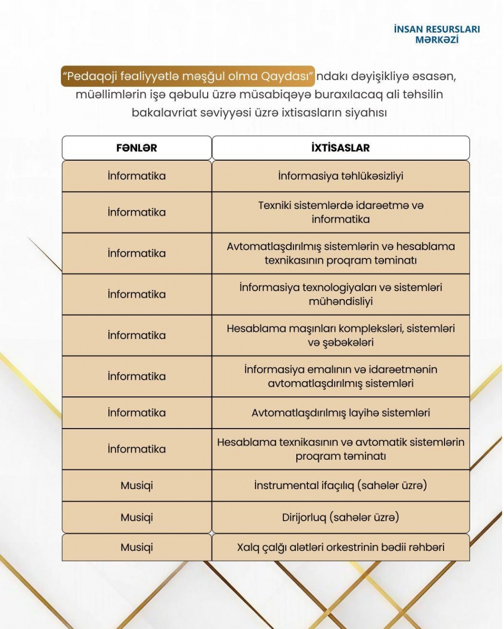 Bildirilib ki, siyahıda qeyd olunan qeyri-pedaqoji ixtisaslara sahib şəxslər müəllimlərin işə qəbulu üzrə müsabiqədə iştirak edə bilərlər.