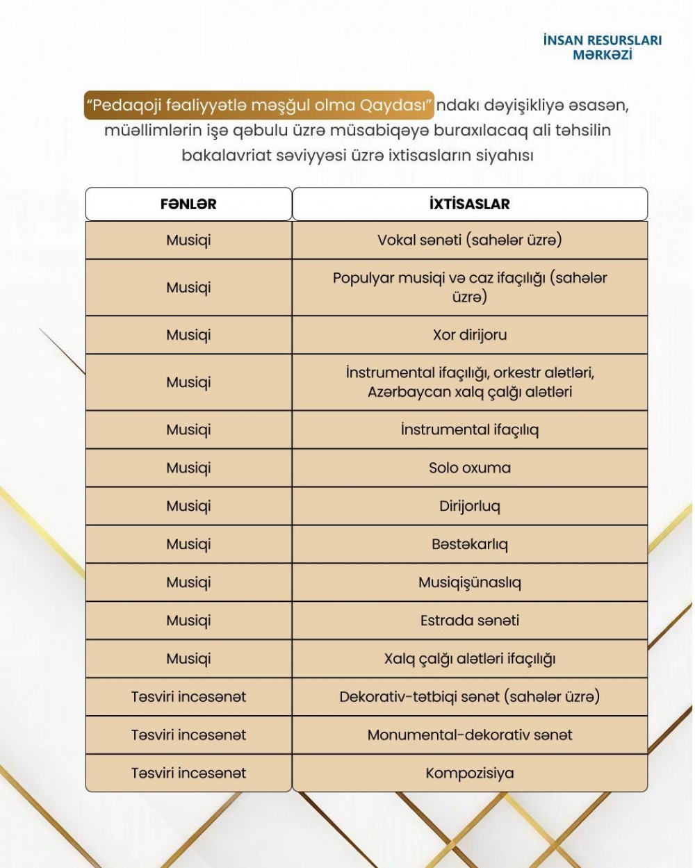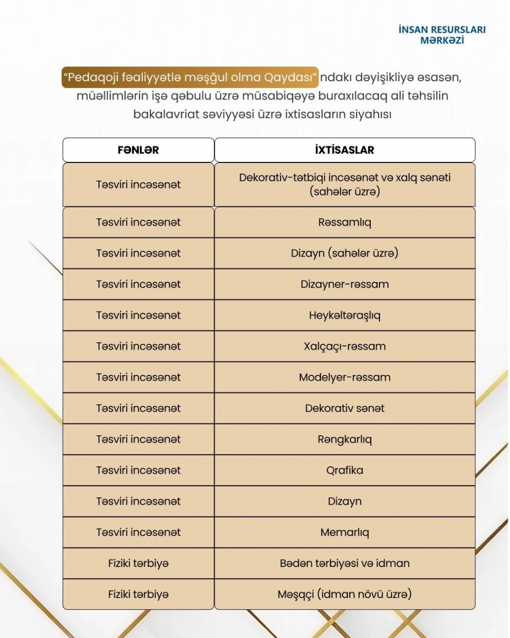 Qeyd edək ki, hər il müsabiqəyə buraxılacaq ixtisasların siyahısı “Pedaqoji fəaliyyətlə məşğul olma Qaydası”nın əlavəsində qeyd edilən ixtisaslara müvafiq olaraq müəyyənləşdirilir.