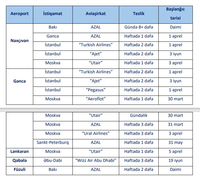 Yaz-yay uçuş cədvəli çərçivəsində Azərbaycanın regional hava limanlarından uçuşların sayı artırılır və yeni istiqamətlər əlavə olunur:
