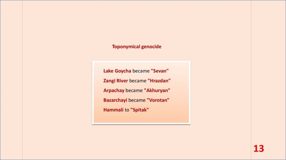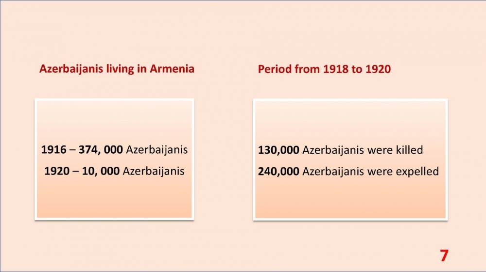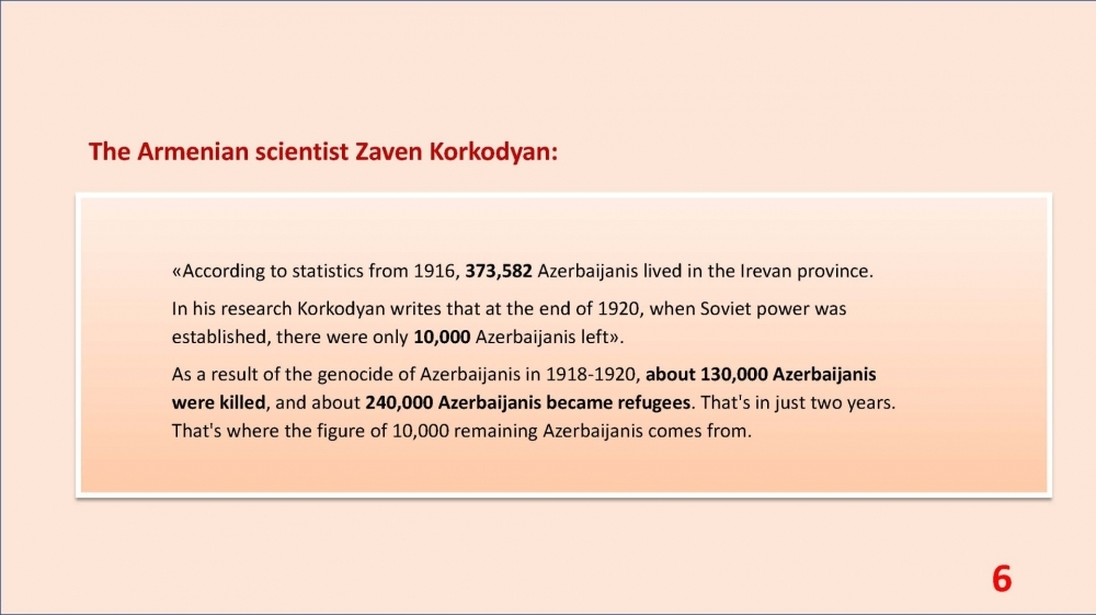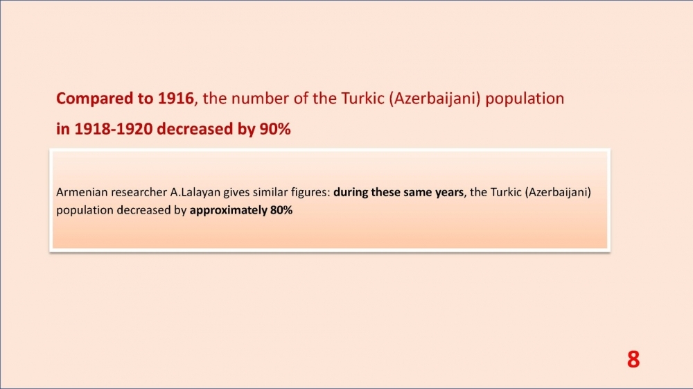 1918-1920-ci illər ərzində 130 minə yaxın azərbaycanlı öldürülüb, daha 240 000 öz evlərini tərk etmək məcburiyyətində qalıb. Bu rəqəmləri eyni zamanda erməni tarixçi A. Lalayanın həmin dövr ərzində Azərbaycanlı əhalinin 80-90% azalmağının qeydə alındığı tədqiqatları da təsdiqləyir.”, -deyə təqdimatda qeyd olunur.