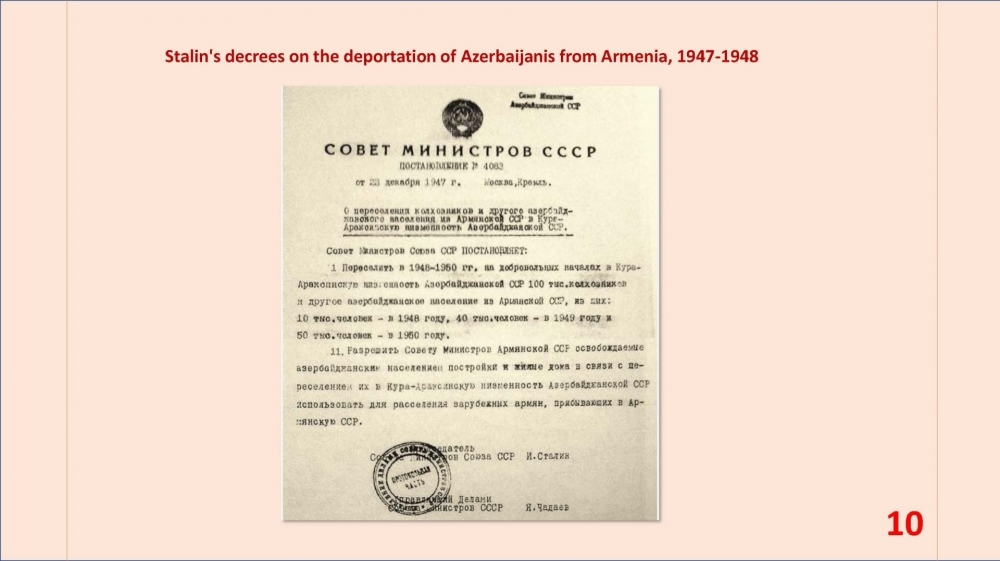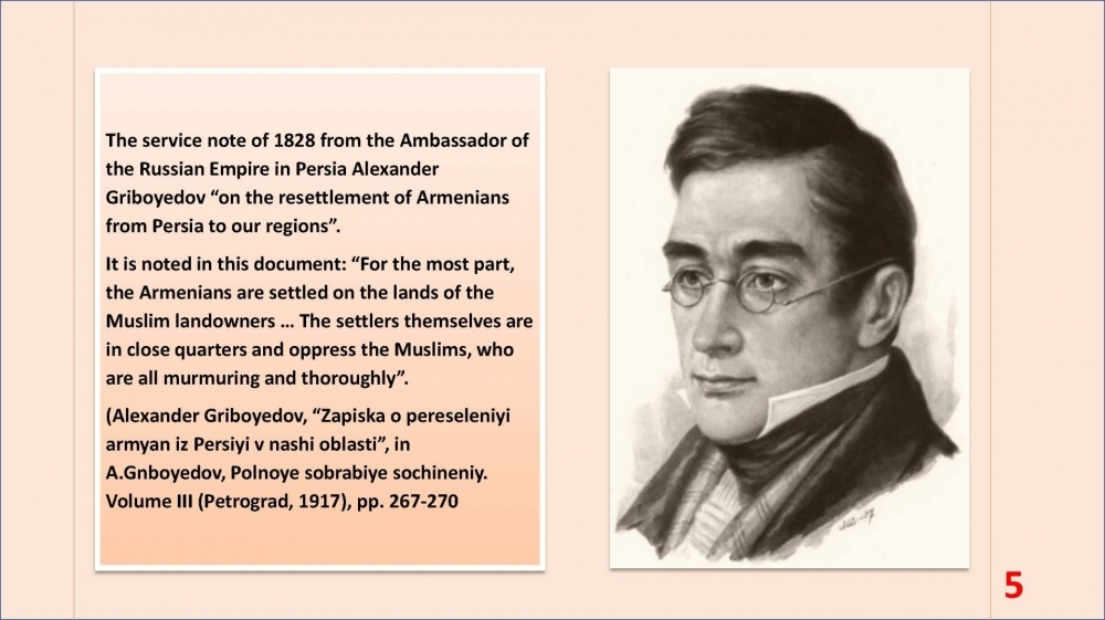 Ekspert, həmçinin, Rusiya diplomatı Aleksandr Qriboyedovun 1828-ci ilə aid arxiv sənədlərindən, xüsusilə də ermənilərin İrandan Cənubi Qafqaza köçürülməsi ilə bağlı yazdığı memoranduma istinad edib. Həmin sənəddə Qriboyedov yazırdı: “Köçürülənlər müsəlmanları sıxışdırırlar, onlar isə narazılıq edir və hiddətlənirlər”.