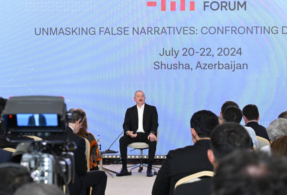 Dövlət başçımız dezinformasiyanın çox zərərverici olduğunu keçmiş münaqişə zamanı bütün erməni diasporunun, ermənipərəst siyasətçilərin, media nümayəndələrinin Azərbaycana qarşı hücum etmələri, ölkəmiz haqqında yanlış narrativlər yayması timsalında geniş izah etdi, həmçinin dezinformasiya yaradıcılarının siyasi məqsədləri, fəaliyyət metodları, təsir mexanizmləri barədə də əhatəli məlumat verdi. Eyni zamanda göstərdi ki, təxribatçı informasiyalardan yeganə xilas yolu həqiqi informasiyalardan səmərəli şəkildə yararlanmaqdır. Azərbaycan Prezidenti forumda informasiya müharibəsinin bitmədiyini, keyfiyyətcə yeni – daha kəskin, sərt mərhələyə qədəm qoyduğunu diqqətə çatdırdı, belə bir dövrdə informasiya sferasında qarşıda duran aktual məsələlərdən də bəhs etdi. İlham Əliyev bununla həm də Azərbaycan cəmiyyətinə və mediasına daha məsuliyyətli və fəal olmaqla bağlı çağırış etdi. Artıq dünyada nüfuzu ilə yetərincə tanınan siyasi lider beynəlxalq media təmsilçilərinə bu məramını da çatdırdı: “Əlbəttə, biz çox arzu edirik ki, media obyektiv olsun, hər kəs obyektiv olsun. Ancaq medianın xüsusi məsuliyyəti var. Çünki medianın mesajları, məsələni işıqlandırması bir çox insanların həyatına təsir edir”.