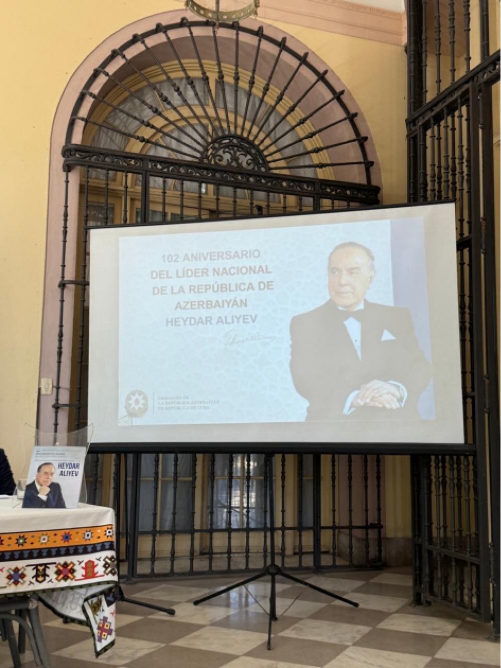 Azərbaycanın Kubadakı səfirliyinin təşkilatçılığı ilə Kuba Xalqlar Dostluğu İnstitutunda Ümummilli Lider Heydər Əliyevin anadan olmasının 102 illiyinə həsr olunmuş elmi-akademik tədbir keçirilib.