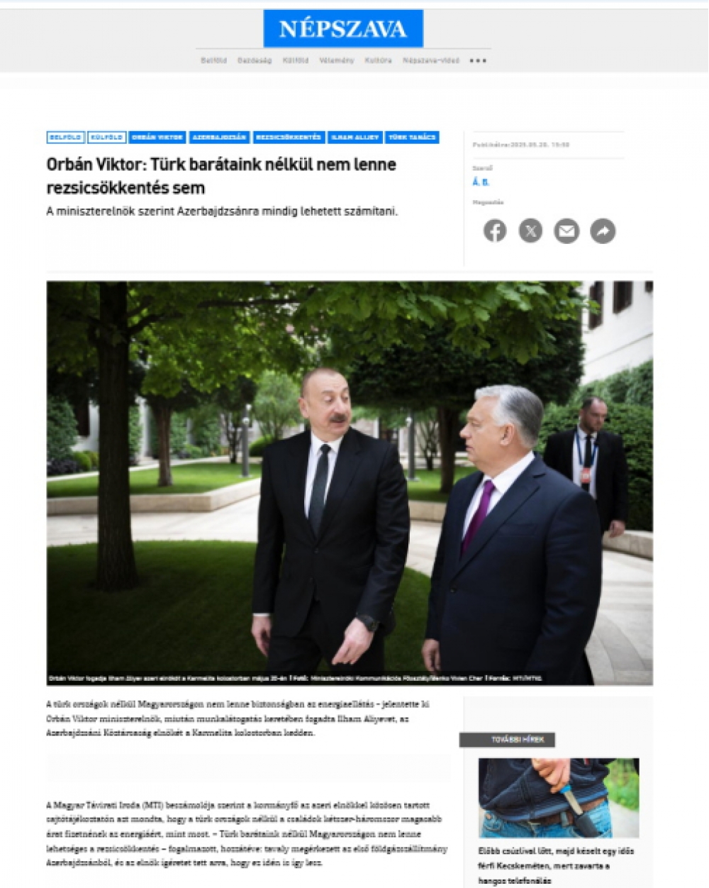 “Nepsava” nəşri, öz növbəsində, “Viktor Orban: türk dostlarımız olmasaydı, heç bir ucuzlaşma olmazdı. Azərbaycana hər zaman arxalanmaq olar” sərlövhəli məqalə dərc edib. Materialda qeyd olunduğu kimi, Baş nazir deyib ki, türk ölkələri olmasaydı, Macarıstan etibarlı enerji təchizatına malik olmazdı və ailələr enerji üçün indikindən iki-üç dəfə çox pul ödəyəcəkdi.