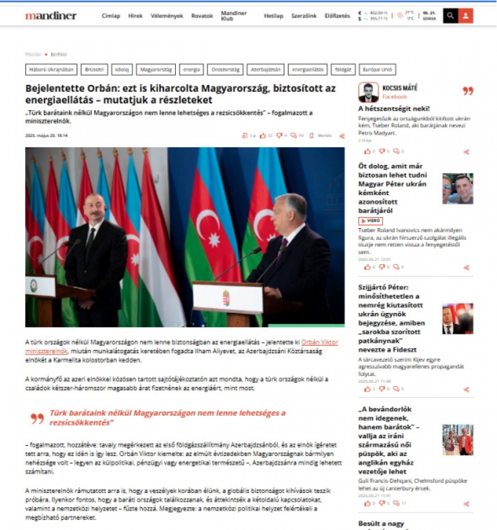 “Mandiner” nəşri “Enerji təchizatı təmin edilir, Orban bu məsələdə Macarıstanın qələbəsini elan edib” sərlövhəli məqaləsində Baş nazirin “Türk dostlarımız olmasaydı, Macarıstanda enerji xərclərinin azaldılması mümkün olmazdı” sözlərini də sitat gətirir.
