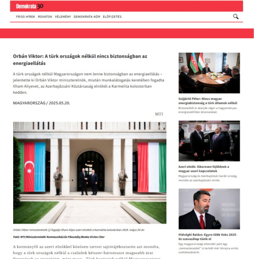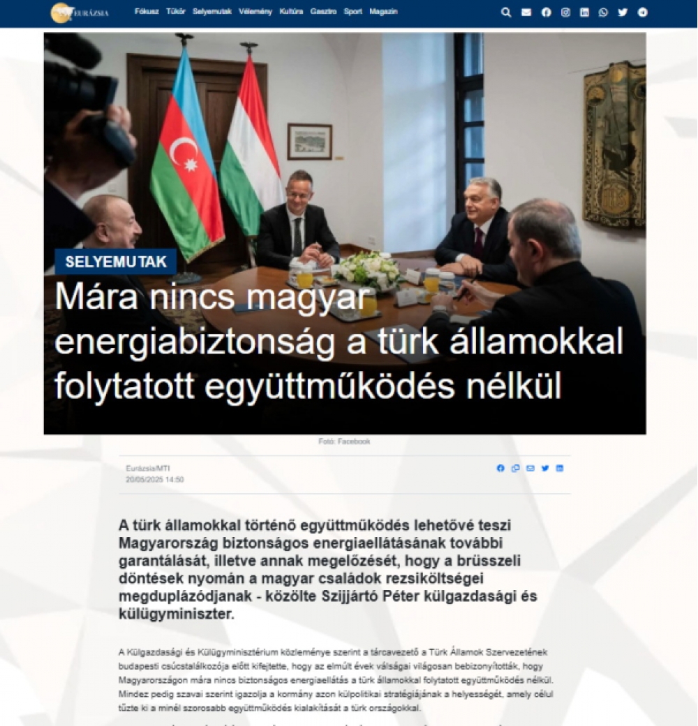 “Eurazsiamagazin.hu” portalında dərc olunan “Bu gün Macarıstanın enerji təhlükəsizliyi türk dövlətləri ilə əməkdaşlıq etmədən mümkün deyil” sərlövhəli məqalə Macarıstanın türk dövlətləri ilə əməkdaşlığına dair bəyanatı ehtiva edir. Qeyd olunur ki, bu, Macarıstanın etibarlı enerji təchizatını daha yaxşı təmin edəcək və Brüsseldə qəbul edilən qərarlar nəticəsində macar ailələrinin kommunal xidmətlər üçün daha çox ödəməli olmasının qarşısını alacaq. Bütün bunlar hökumətin TDT dövlətləri ilə mümkün qədər sıx əməkdaşlığın qurulmasına yönəlmiş xarici siyasət kursunun düzgünlüyünü təsdiqləyir.