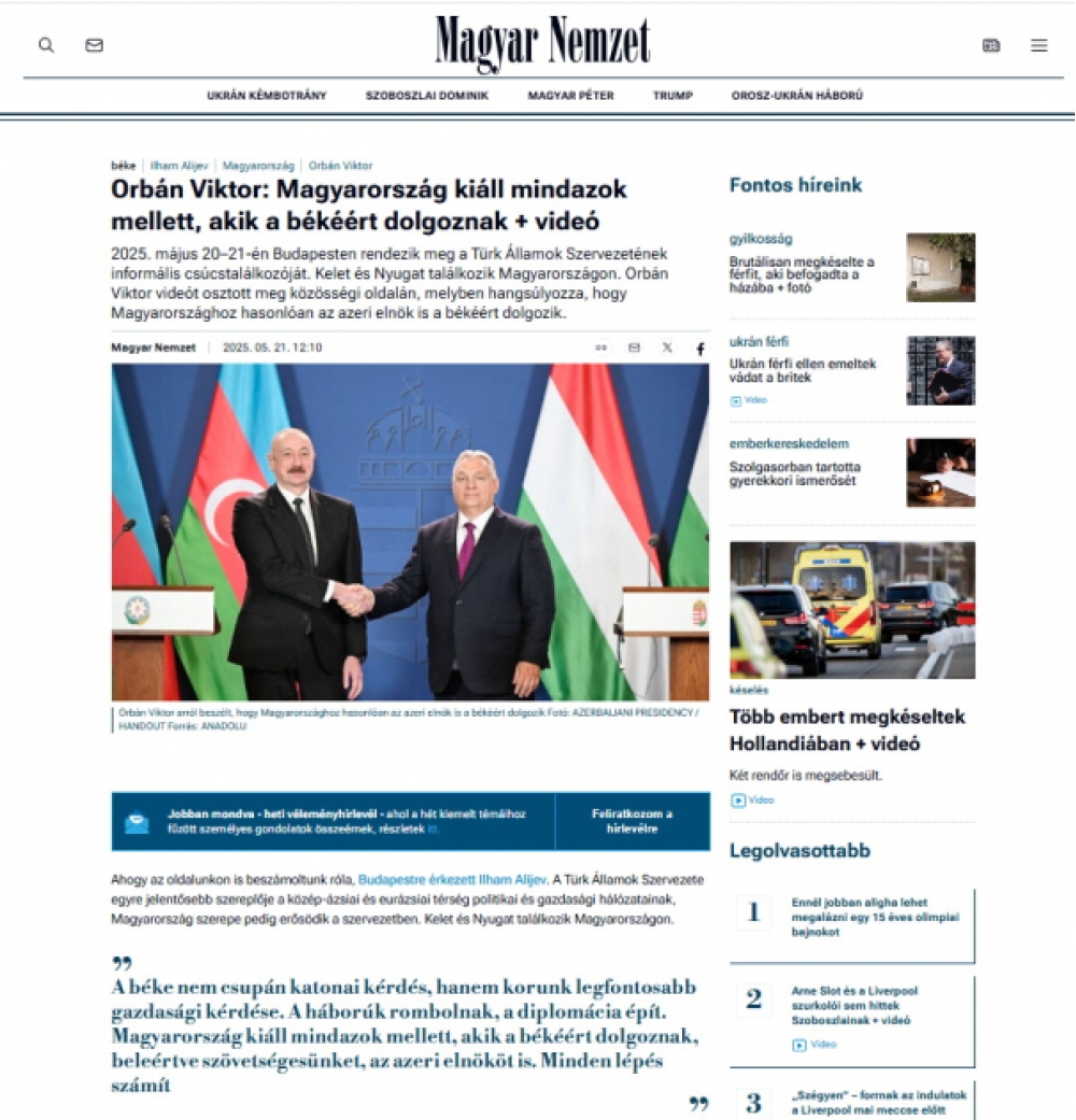 Məqalədə qeyd olunur: “Orban vurğulayıb ki, Macarıstan son onilliklərdə istər xarici siyasətdə, istər maliyyə, istərsə də enerji sahəsində hansı çətinliklərlə üzləşməsindən asılı olmayaraq, həmişə Azərbaycana arxalana bilər”. Nəşr onu da yazır ki, macar lideri öz bəyanatında qeyd edib: biz təhdidlər dövründə yaşayırıq və qlobal təhlükəsizlik sınaqdan keçirilir. Məqalədə daha sonra deyilir: “Belə bir məqamda dost ölkələrin görüşü və ikitərəfli münasibətləri, beynəlxalq vəziyyəti təhlil etməsi vacibdir. Hazırkı beynəlxalq siyasi vəziyyətdə etibarlı tərəfdaşlar daha da dəyərlidir. Türk Dövlətləri Təşkilatının tarixində ilk dəfə Macarıstanda sammit keçiriləcək və bununla bağlı Azərbaycan Prezidenti Macarıstanı təbrik edib”.