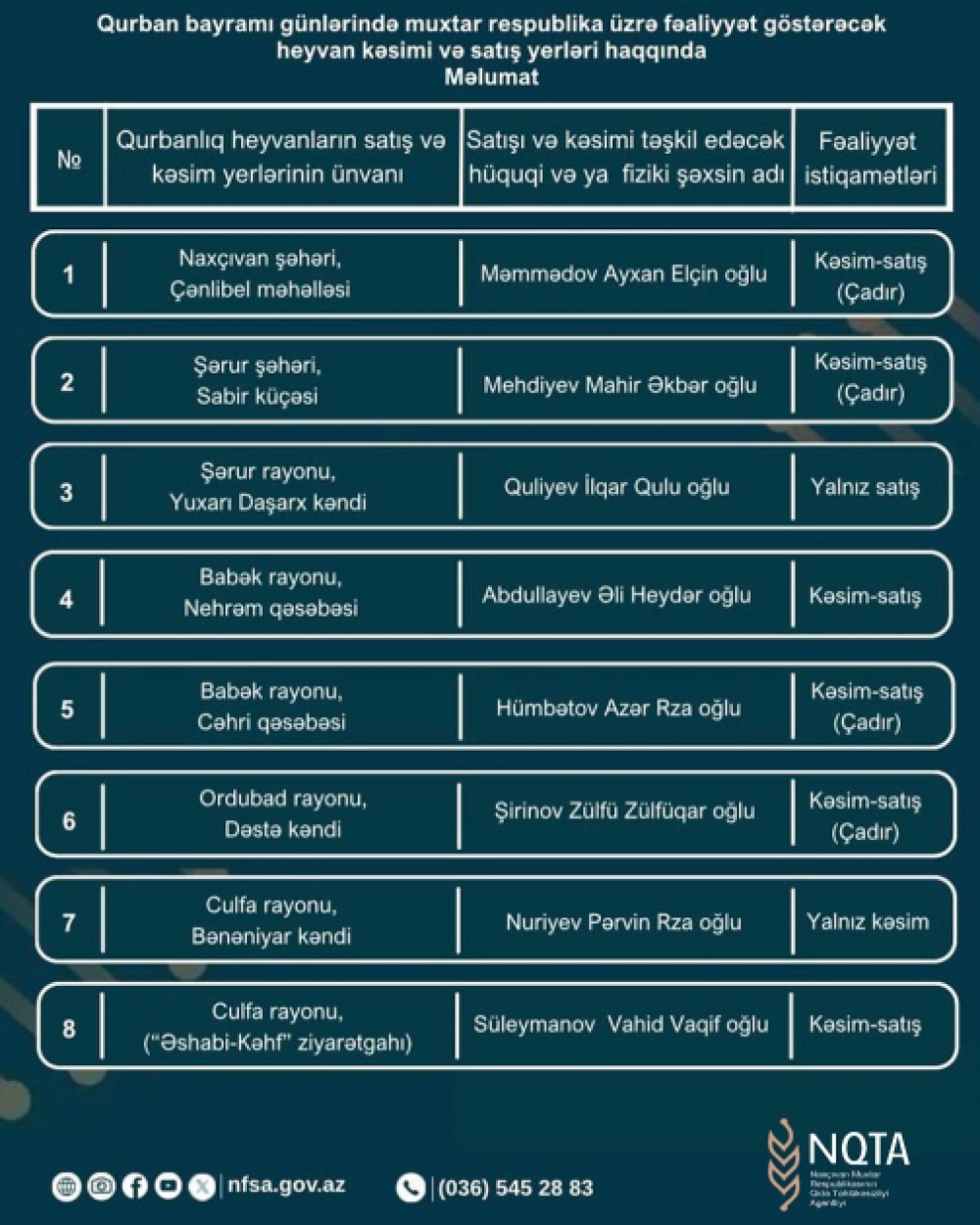 Vətəndaşlar bayram günlərində saat 08:00-dan 20:00-dək qurbanlıq heyvanları satmaq, almaq və ya kəsdirmək üçün xidmətlərdən istifadə edə bilərlər.