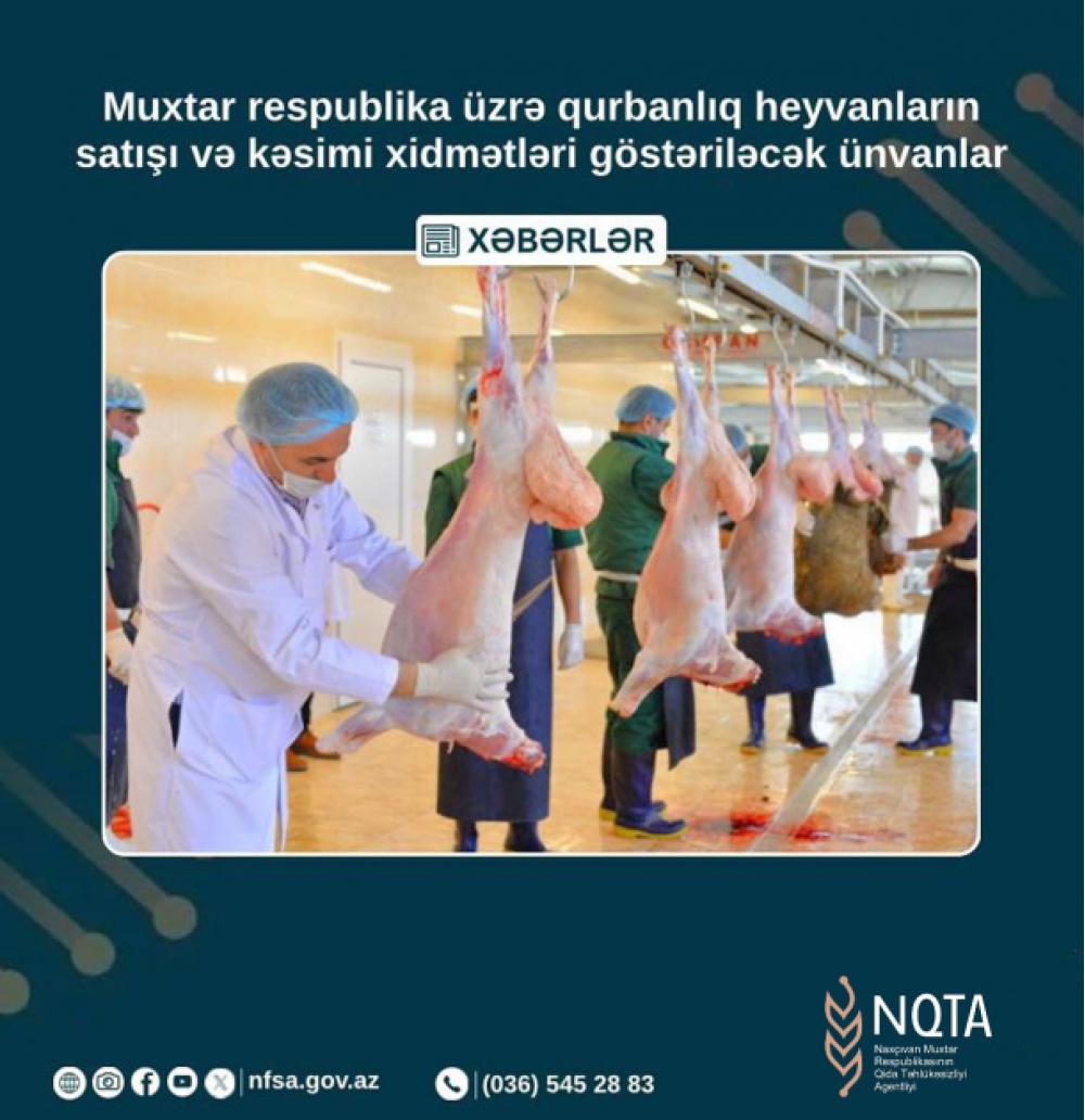 Agentlikdən “İki sahil”ə bildirilib ki, qurbanlıq heyvan kəsimi və satışının müvafiq norma və qaydalara uyğun və rahat şəraitdə həyata keçirilməsi məqsədilə muxtar respublika üzrə 8 ünvanda qurbanlıq heyvanların satışı və kəsimi xidmətləri təşkil olunacaq. Ondan 4-ü müasir tələblərə cavab verən, bütün zəruri avadanlıqlarla təchiz olunmuş səyyar heyvan kəsimi çadırlarıdır. Digər 6 ünvanda həm kəsim, həm satış, 1-ində yalnız heyvan kəsimi xidmətləri, 1-ində isə yalnız diri heyvanların satışı təklif olunacaq. Həmin məntəqələrdə baytarlıq nəzarətindən keçmiş və sanitar-gigiyenik tələblər gözlənilməklə kəsilmiş qurbanlıq heyvanlar əhaliyə təqdim olunacaq.
