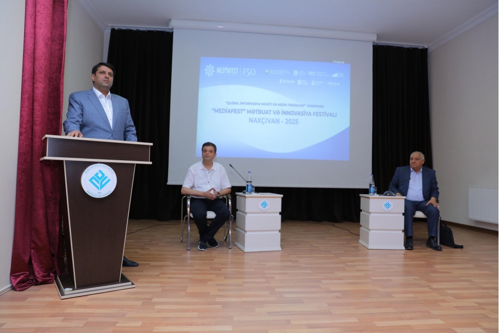 “MEDİAFEST-2025” çərçivəsində mayın 31-də Naxçıvan Dövlət Universitetində Bakı Dövlət Universitetinin professoru Qulu Məhərrəmli və Bakı Dövlət Universitetinin Jurnalistika fakültəsinin dekanı Vüqar Zifəroğlu tələbələrlə görüşüblər.