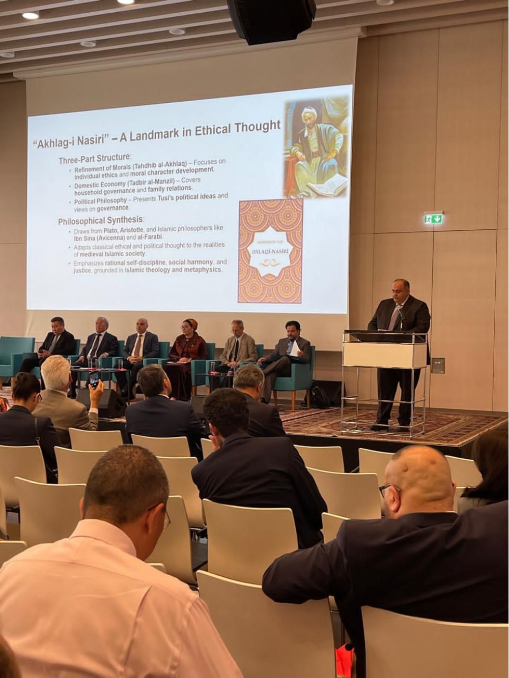 Anar Nağıyev çıxışında ilk olaraq Aristotel fəlsəfəsini Şərqdə inkişaf etdirən, İbn Sinanın tələbəsi olan azərbaycanlı mütəfəkkir Əbülhəsən Bəhmənyar əl-Azərbaycaninin Orta əsr Şərq fəlsəfəsinə töhfəsindən danışaraq onun məntiq və metafizikada təməl mətni olan “Ət-Təhsil” traktatından geniş danışıb. Rektor Şərq musiqi təfəkkürünü elmi cəhətdən sistemləşdirən Safiəddin əl-Urmavinin orta əsr elminə töfhəsindən bəhs edərək, onun əbcəd sisteminin itirilən melodiyaları qoruyub saxlamağa imkan verdiyini bildirib.