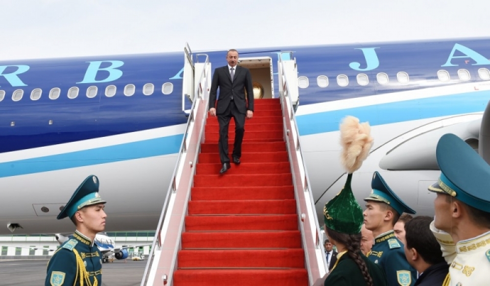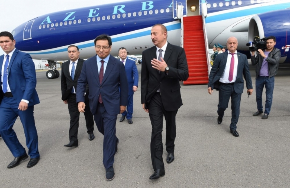 Dövlətimizin başçısını Qazaxıstan Baş nazirinin müavini Yerbolat Dosayev və digər rəsmi şəxslər qarşıladılar.