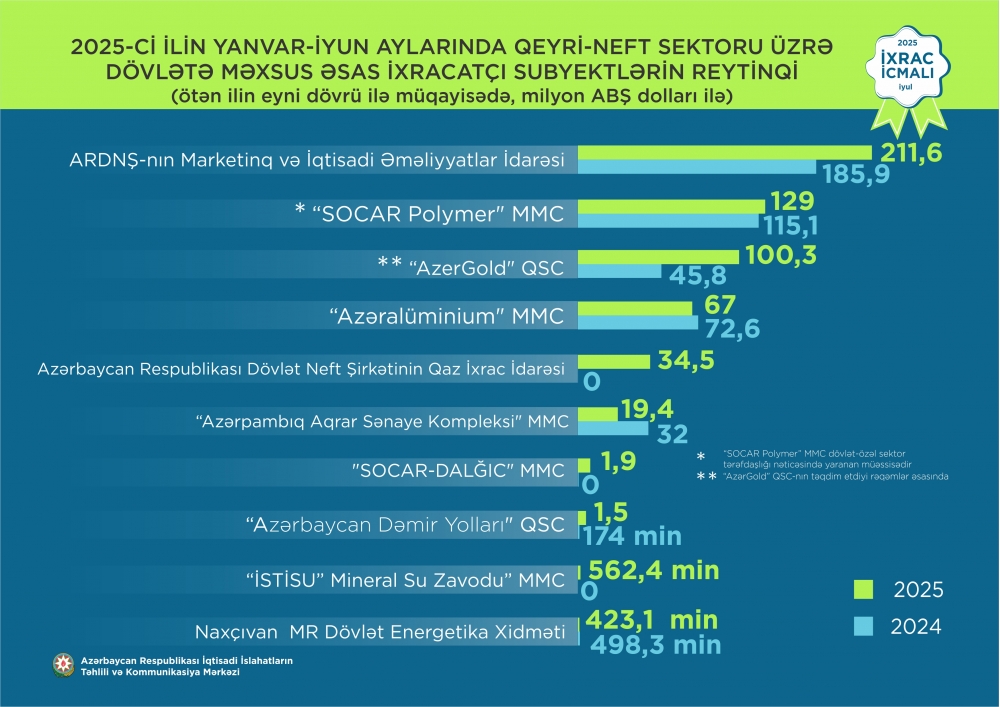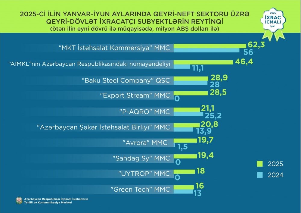2025-ci ilin yanvar-iyun ayları üzrə hazırlanmış qeyri-dövlət ixracatçı subyektlərin reytinqində ilk onluqda aşağıdakı şirkətlər təmsil olunublar: "MKT İstehsalat Kommersiya" MMC, "Azərbaycan İnterneyşnl Mayninq Kompani Limited Şirkəti"nin Azərbaycan Respublikasındakı Nümayəndəliyi, "Baku Steel Company" QSC, "Export Stream" Məhdud Məsuliyyətli Cəmiyyəti, "P-AQRO" MMC,"Azərbaycan Şəkər İstehsalat Birliyi" MMC, "Avrora" Məhdud Məsuliyyətli Cəmiyyəti,"Sahdag SY" Məhdud Məsuliyyətli Cəmiyyəti,"UYTROP" Məhdud Məsuliyyətli Cəmiyyəti, "Green Tech" MMC.