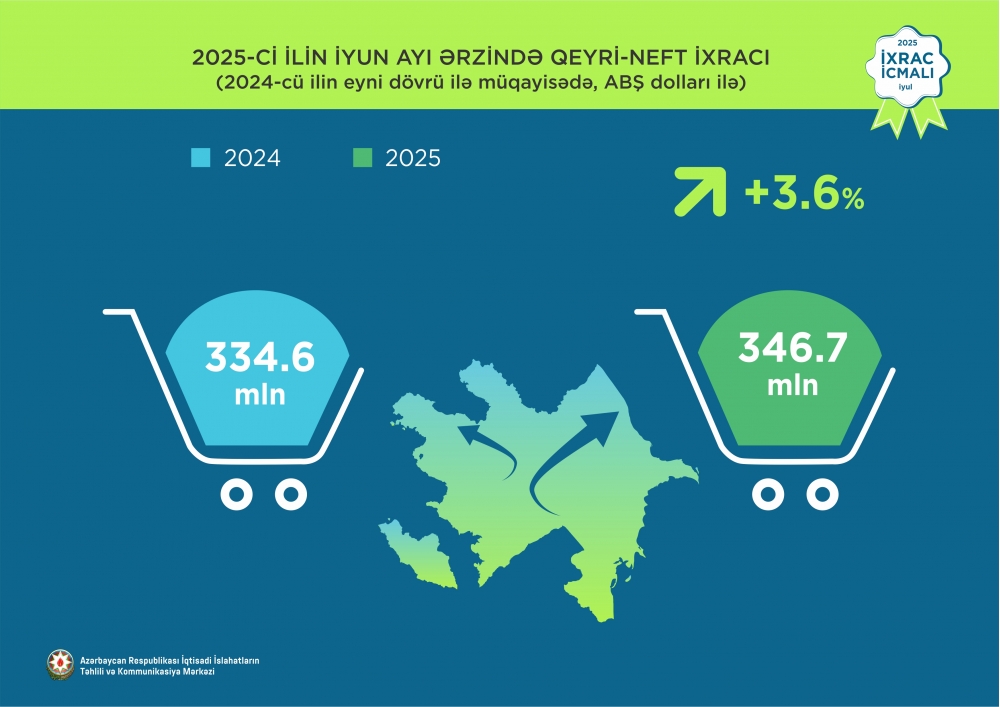 2025-ci ilin iyun ayında Rusiya Federasiyasına 143,1 milyon ABŞ dolları, Türkiyəyə 35.9 milyon ABŞ dolları, Gürcüstana 29,3 milyon ABŞ dolları, İsveçrəyə 23.6 milyon ABŞ dolları, Ukraynaya isə 19,3 milyon ABŞ dolları dəyərində qeyri-neft sektoruna aid mal ixrac edilib.