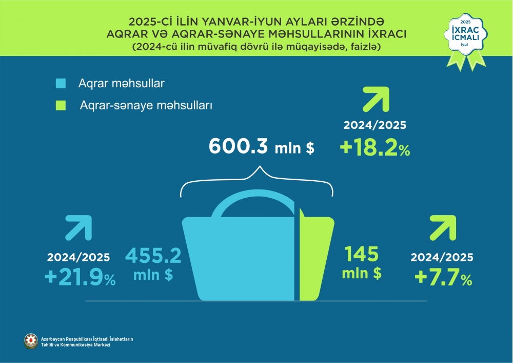 Cari ilin ilk altı ayı ərzində aqrar məhsulların ixracı 21.9% artaraq 455,2 milyon ABŞ dolları, aqrar-sənaye məhsullarının ixracı isə 7,7% artaraq 145 milyon ABŞ dollarına bərabər olub. Bütövlükdə, aqrar və aqrar-sənaye məhsullarının birgə ixracı 18.2% artaraq 600,3 milyon ABŞ dolları təşkil edib.