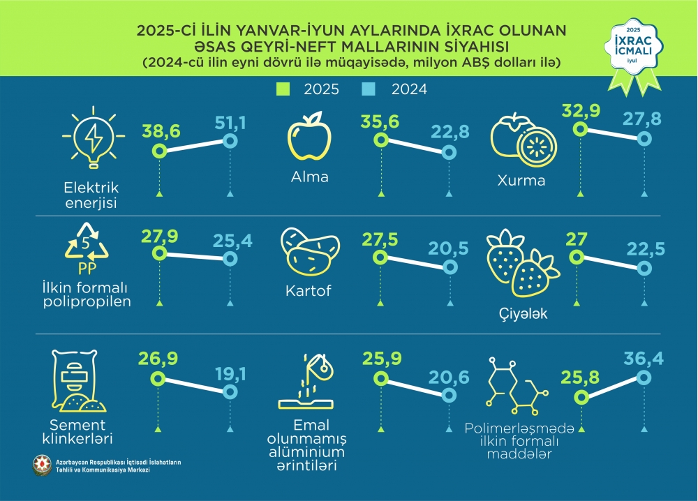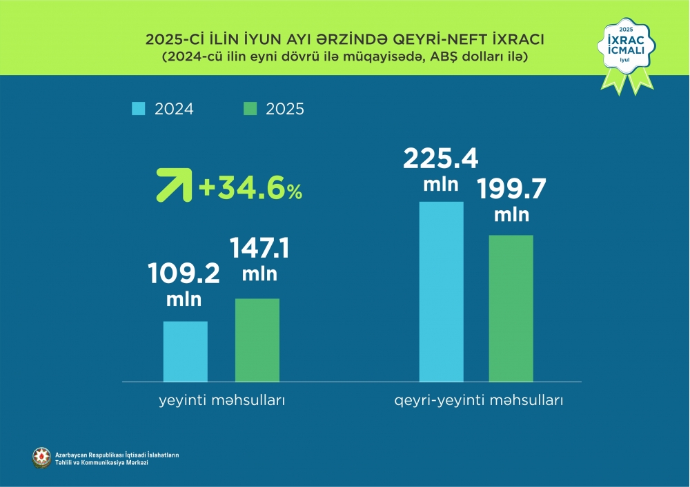 İqtisadi İslahatların Təhlili və Kommunikasiya Mərkəzi (İİTKM) “İxrac icmalı”nın iyul sayını təqdim edib. İcmala əsasən, 2025-ci ilin yanvar-iyun aylarında Azərbaycanın qeyri-neft sektoru üzrə ixracı 2024-cü ilin müvafiq dövrü ilə müqayisədə 9.9% artaraq 1,8 milyard ABŞ dolları təşkil edib. Bu dövrdə yeyinti məhsulları üzrə ixrac 19,1% artaraq 564.7 milyon ABŞ dollarına bərabər olub.