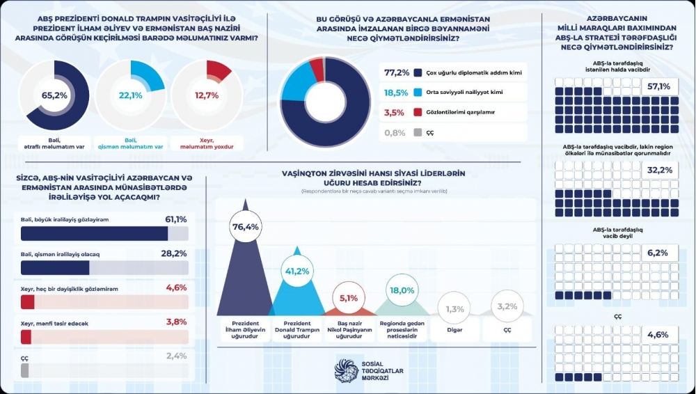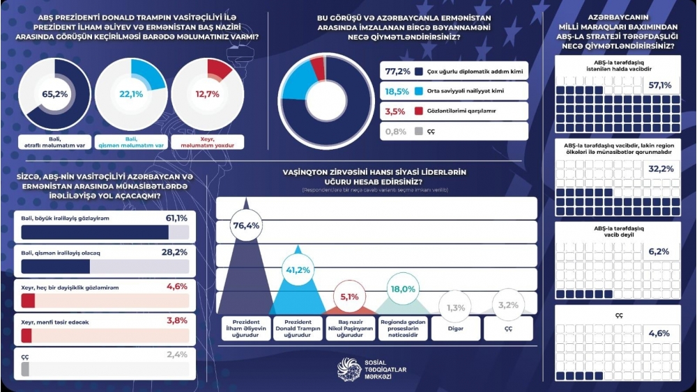 Sosial Tədqiqatlar Mərkəzi (STM) ABŞ Prezidenti Donald Trampın vasitəçiliyi ilə Prezident İlham Əliyev və Ermənistan Baş naziri Nikol Paşinyan arasında Vaşinqtonda keçirilən görüş və imzalanan bəyannamələr, həmçinin Azərbaycan və ABŞ arasında strateji tərəfdaşlıq məsələləri ilə bağlı ölkə ictimaiyyətinin fikirlərini öyrənmək məqsədilə sorğu keçirib.