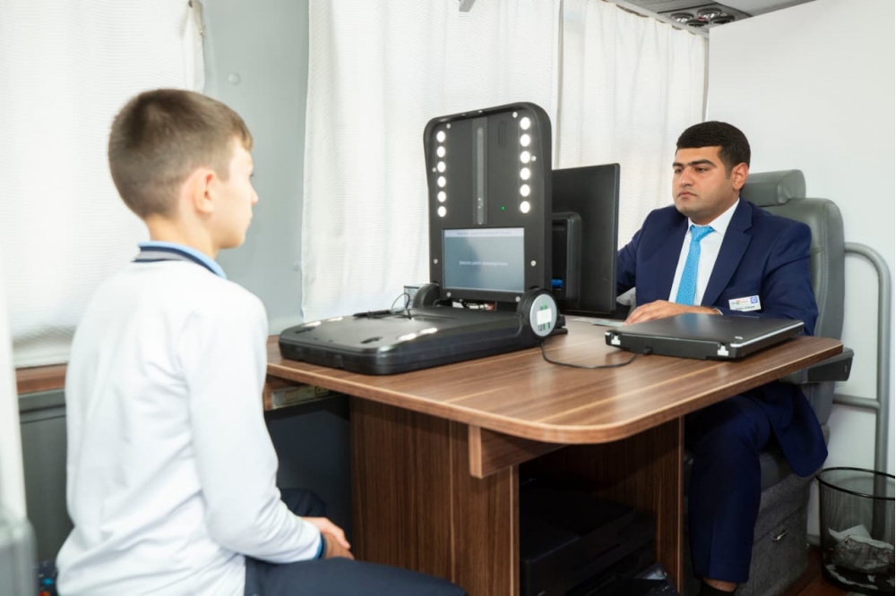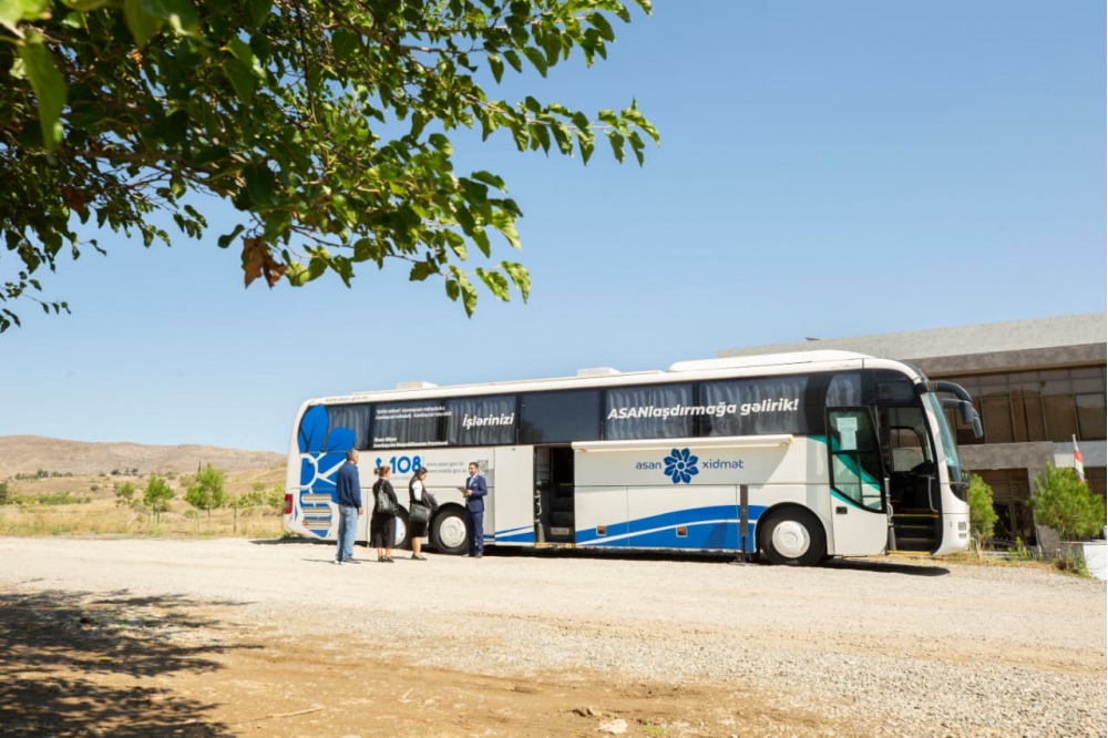 Nəhayət, avtobusumuz dayanır və biz şəhərin kənarında təyin olunmuş məntəqəyə çatırıq. Burada Azərbaycan Respublikasının Prezidenti yanında Vətəndaşlara Xidmət və Sosial İnnovasiyalar üzrə Dövlət Agentliyinin (“ASAN xidmət”) xüsusi təchiz edilmiş iri avtobusu, yanında da bir neçə yerli sakin dayanıb. İki gündür ki, onlara səyyar şəkildə ASAN xidmət göstərilir.